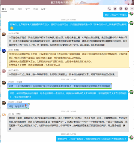 全新的教學(xué)模式對大多數(shù)高校教師來說都是第一次經(jīng)歷,難免有些環(huán)節(jié)做的不到位或者沒有考慮周全。大部分老師還是在家中完成備課、直播、輔導(dǎo)等工作,針對在線課程面對面的交流探討較少。我們幾位老師每次課后都會在QQ群中一起分享經(jīng)驗(yàn)和心得:“我開啟了‘舉手’功能學(xué)生們不積極發(fā)言怎么辦?”“我怎么確定學(xué)生在認(rèn)真聽課???”“騰訊課堂生成的考勤記錄很不錯,可以看到學(xué)生們的學(xué)習(xí)時長。”通過這樣不斷的交流,快速解決問題,并相互間取長補(bǔ)短,繼而提升在線教學(xué)的教學(xué)質(zhì)量。