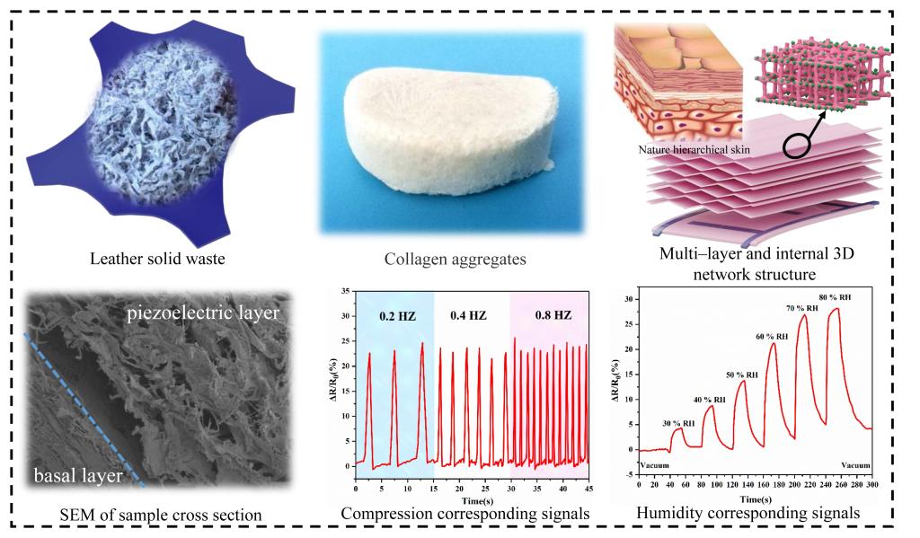針對(duì)現(xiàn)有柔性傳感材料存在的價(jià)格昂貴、不可降解、耐久性和生物相容性難以共存等問題,王學(xué)川等人采用層級(jí)可控降解技術(shù)從含鉻廢棄皮革中提取膠原聚集體,并以其為柔性材料制備出了一種新型成本低、性能高、環(huán)境友好、功能多的柔性傳感器。天然皮膠原聚集體的生物相容性極佳,通過結(jié)構(gòu)設(shè)計(jì)以及材料改性,可極大增加膠原基傳感器的耐用性。該多功能柔性傳感器具有多維識(shí)別能力、快速響應(yīng)和寬動(dòng)態(tài)響應(yīng)范圍,且對(duì)濕度具備優(yōu)良的響應(yīng)性能,響應(yīng)時(shí)間相對(duì)傳統(tǒng)的濕度傳感器較短,加之其成本低、性能高、環(huán)境友好、多功能等優(yōu)勢(shì),在實(shí)時(shí)健康監(jiān)控、生物醫(yī)學(xué)和智能機(jī)器人領(lǐng)域具備廣闊的前景。