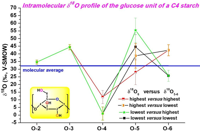 植物來源葡萄糖分子內(nèi)氧同位素組成(18O/16O)是植物光合、代謝、生理及環(huán)境信息的忠實(shí)記錄者,測定分子內(nèi)氧同位素組成卻是一個巨大的技術(shù)挑戰(zhàn)。周友平教授領(lǐng)導(dǎo)的天然產(chǎn)物穩(wěn)定同位素組學(xué)團(tuán)隊發(fā)展了合成有機(jī)化學(xué)(圖1)、氣相色譜/熱解/同位素比質(zhì)譜學(xué)(GC/Py/IRMS)和化學(xué)動力學(xué)計算相結(jié)合的方法,首次證實(shí)C4來源植物淀粉中葡萄糖分子內(nèi)氧同位素分布非均一性(圖2)。研究結(jié)果表明O-2相對分子平均值稍微富集18O,O-3相對富集而O-4和O-6相對貧化。O-6的相對貧化推測與葉片光合作用過程中RuBP(1.5-二磷酸核酮糖)中C-5上氧原子與葉片中蒸發(fā)富集水交換的可能性最小有關(guān),據(jù)此推測,O-6最有可能記錄根部水源的信號。
