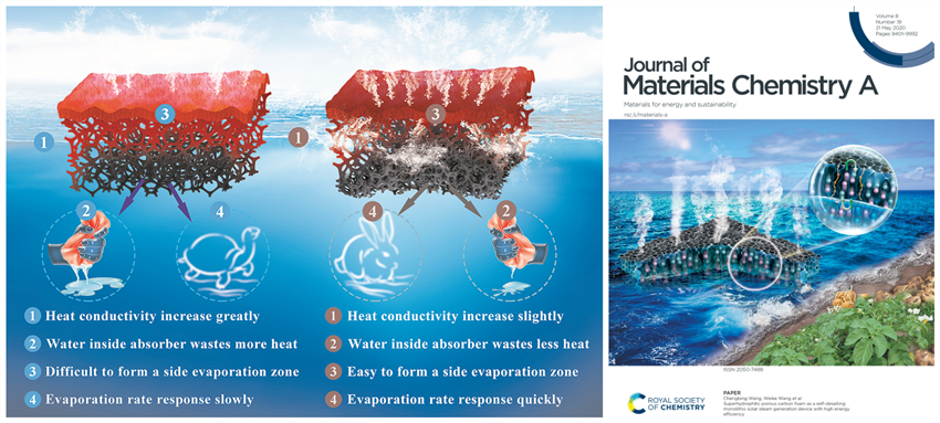 學(xué)術(shù)骨干王成兵教授團(tuán)隊(duì)采用“旋轉(zhuǎn)-填充”新組裝法合成一種生物安全性高、機(jī)械輕度大、自漂浮時(shí)間長(zhǎng)的墨魚(yú)汁基太陽(yáng)能驅(qū)動(dòng)界面蒸發(fā)器件,成果發(fā)表在國(guó)際知名期刊Nano Energy上;其關(guān)于土豆碳基材料應(yīng)用于界面蒸發(fā)的研究成果發(fā)表于國(guó)際知名期刊Journal of Materials Chemistry A。