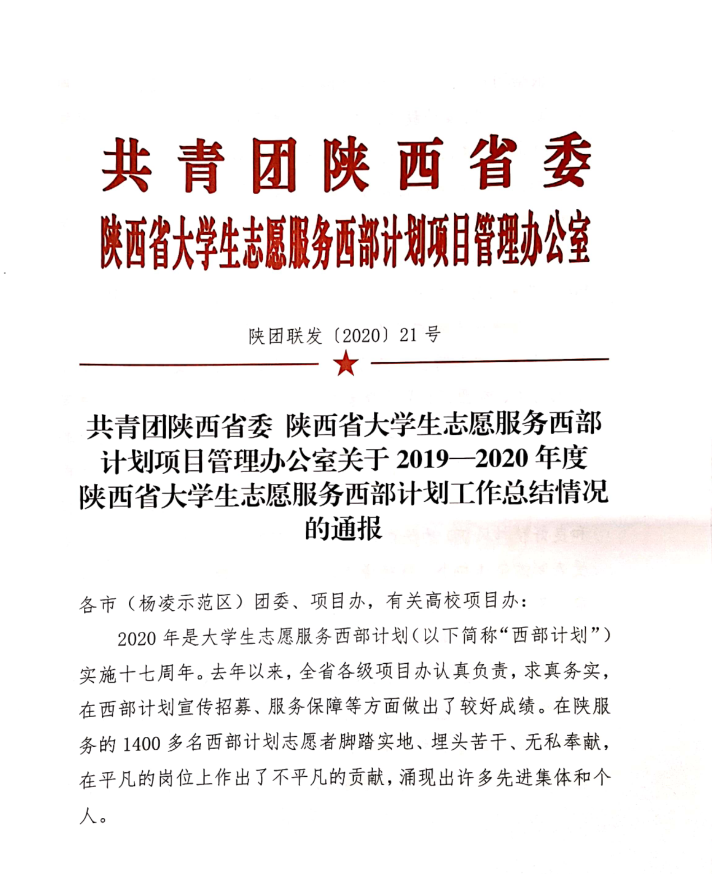 近日,共青團(tuán)陜西省委在西安舉辦2020年陜西省大學(xué)生志愿服務(wù)西部計(jì)劃暨研究生支教團(tuán)在線培訓(xùn)。在開班儀式上通報(bào)表彰了2019-2020年度陜西省大學(xué)生志愿服務(wù)西部計(jì)劃先進(jìn)集體,我校西部計(jì)劃項(xiàng)目辦獲“陜西省大學(xué)生志愿服務(wù)西部計(jì)劃先進(jìn)集體”榮譽(yù)稱號(hào)。