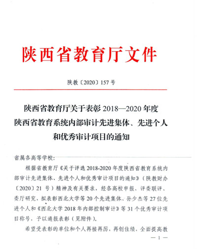 近日,陜西省教育廳對全省2018-2020年度教育系統內部審計先進集體、先進個人和優(yōu)秀審計項目進行了表彰,我校榮獲2018-2020年度陜西省教育系統內部審計先進集體、蔡儆同志榮獲內審先進工作者、兩項審計項目獲評優(yōu)秀審計項目。