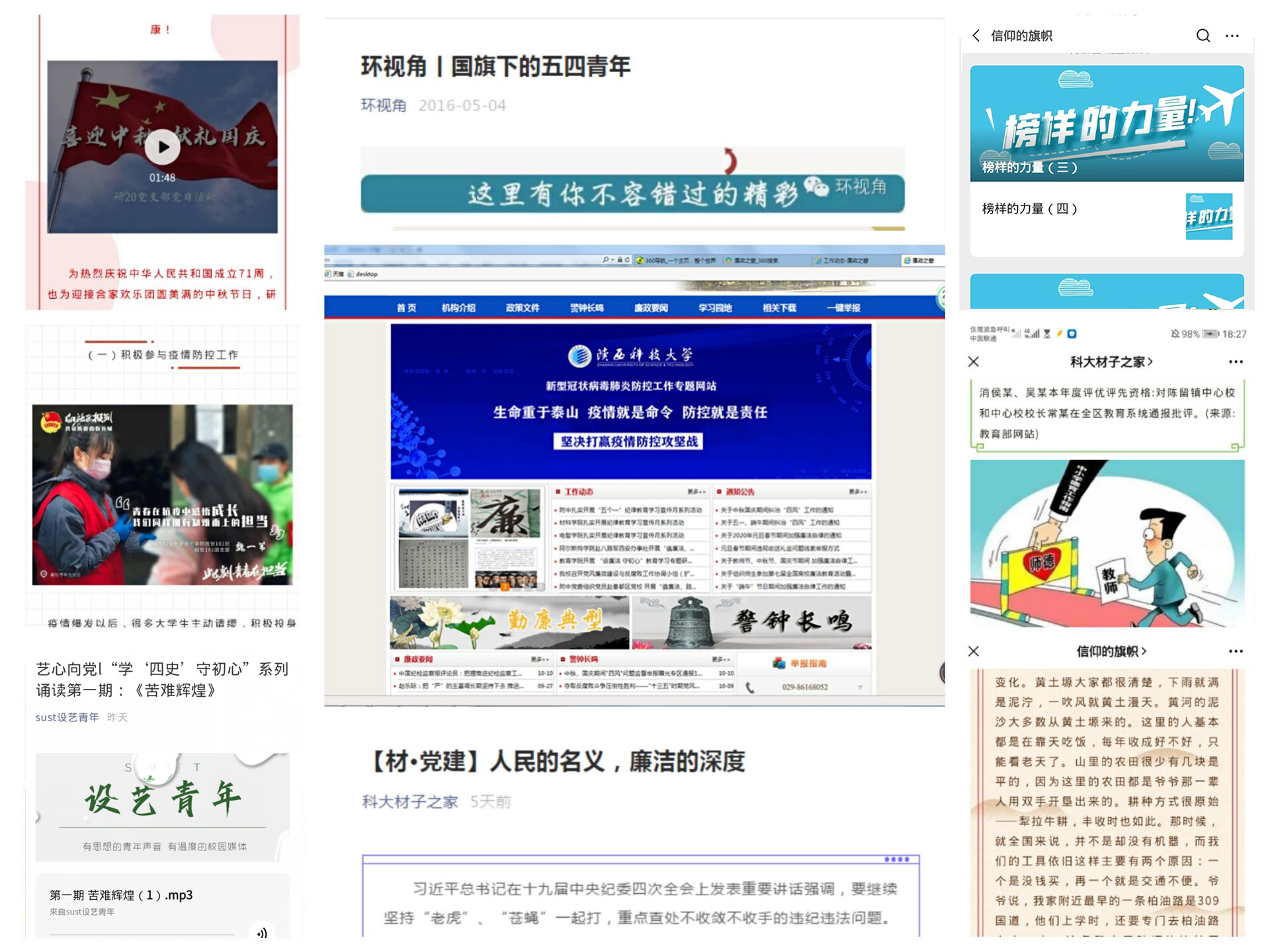 校官網(wǎng)首頁(yè)陸續(xù)登載13條新聞報(bào)道宣傳月活動(dòng),“廉政之窗”專題網(wǎng)站開(kāi)辟專欄報(bào)道二級(jí)黨組織活動(dòng)情況,各學(xué)院官網(wǎng)跟進(jìn)宣傳;材料學(xué)院、化工學(xué)院、環(huán)境科學(xué)與工程學(xué)院微信公眾號(hào)推送師德失范問(wèn)題典型案例、黨紀(jì)知識(shí),報(bào)道學(xué)習(xí)和活動(dòng)開(kāi)展情況;馬克思主義學(xué)院微信群推送學(xué)習(xí)內(nèi)容和典型案例;附中黨委、后勤黨總支設(shè)計(jì)制作宣傳海報(bào),建起黨風(fēng)廉政建設(shè)宣傳欄;全校上下多方位營(yíng)造了濃厚的紀(jì)律教育學(xué)習(xí)和宣傳氛圍。
