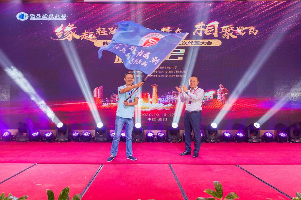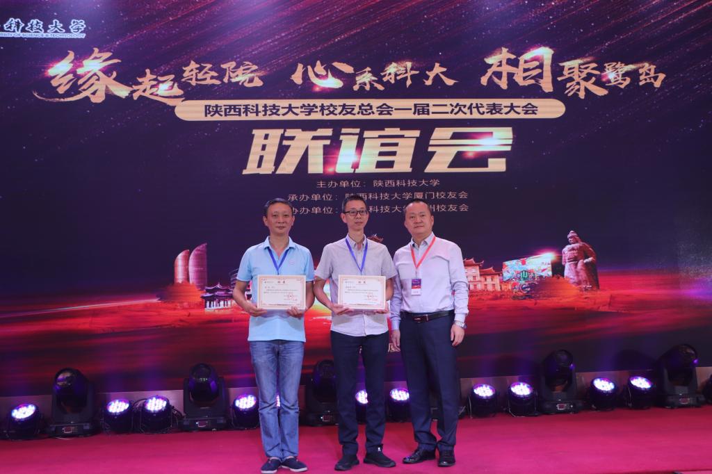 在廈門校友會、泉州校友會主辦的校友聯(lián)誼會上,李學(xué)軍為福建陜科輕院科技有限公司授牌,在公司設(shè)立陜西科技大學(xué)技術(shù)孵化中心。