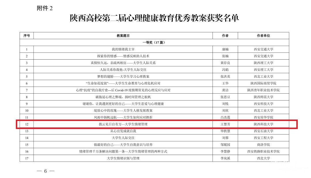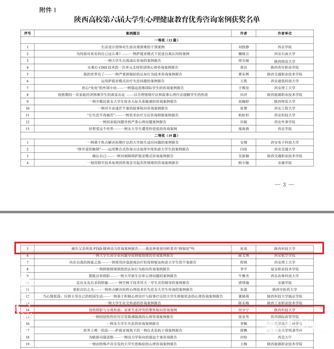 10月28日和29日,省委教育工委下發(fā)了關(guān)于陜西高校第五屆“陽光護航”心理育人宣傳季省級有關(guān)活動獲獎情況的通報。心理中心教師王慧芳作品《撥云見日自有方—大學生情緒管理》榮獲陜西高校第二屆心理健康教育優(yōu)秀教案一等獎,電氣與控制工程學院輔導員任歡作品《愛的語言》榮獲陜西高校第二屆心理健康教育優(yōu)秀教案三等獎。心理中心教師張易案例《痛失父親所致PTSD精神動力咨詢案例報告——我也和爸爸同樣患有“抑郁癥”嗎?》、材料科學與工程學院黨委副書記田少寧案例《創(chuàng)傷陰影與分離焦慮:親密關(guān)系沖突的聚焦取向咨詢案例》榮獲陜西高校第六屆大學生心理健康教育優(yōu)秀咨詢案例二等獎。電氣與控制工程學院學生楊康《意義》、食品與生物工程學院學生宋雨《成人成己》在陜西高校大學生“心相遇 愛同行——心理健康教育伴我成長”主題征文活動中榮獲三等獎,電氣與控制工程學院輔導員任歡、食品與生物工程學院輔導員韓曄榮獲優(yōu)秀指導教師稱號。