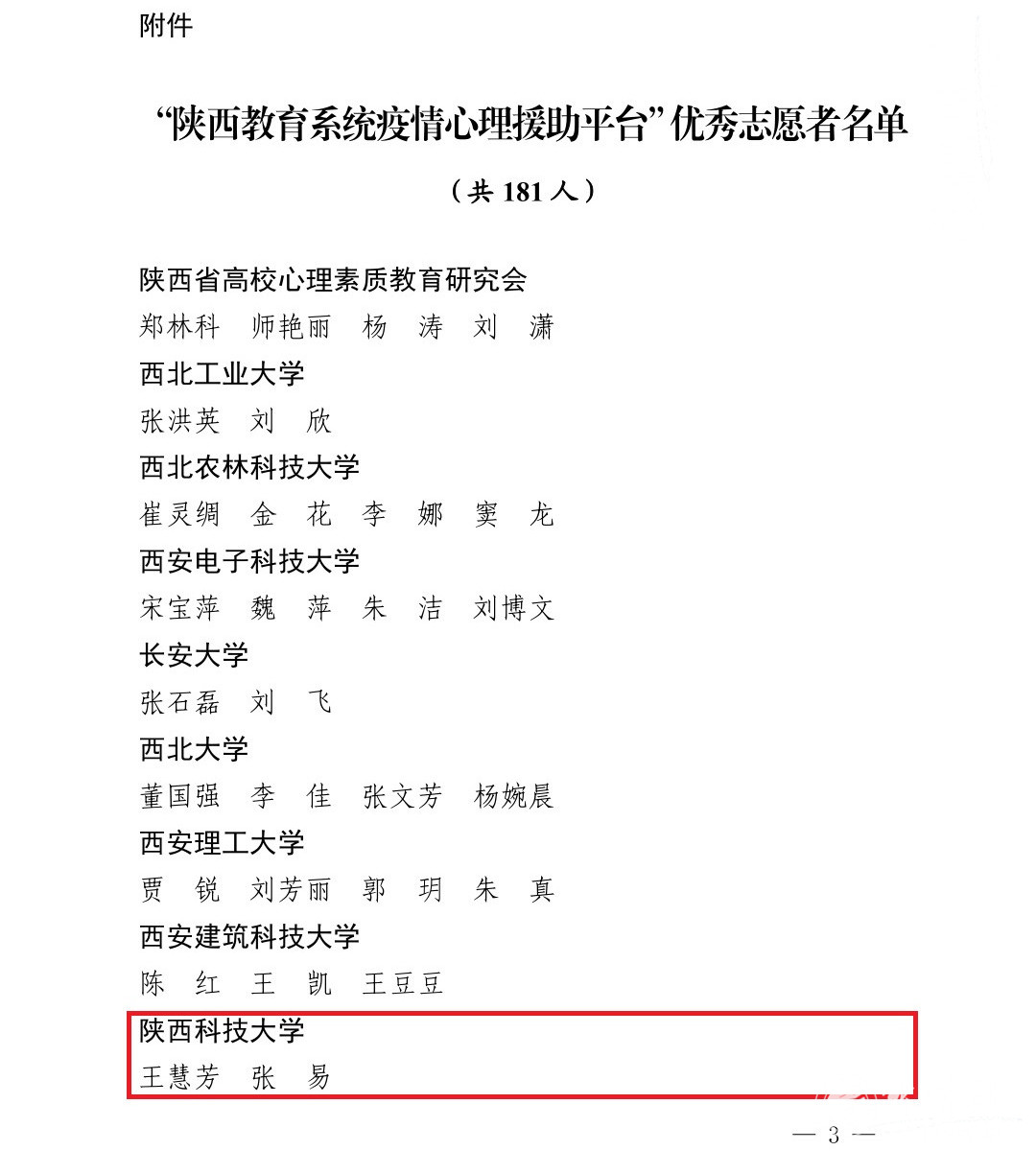 10月28日,陜西省委教育工委對參與疫情期間心理援助志愿服務工作的志愿者進行了通報表彰。校心理健康教育中心教師王慧芳和張易積極參與“陜西教育系統(tǒng)疫情心理援助志愿者工作”,面向全省師生和人民群眾開展疫情相關(guān)的心理援助熱線和網(wǎng)絡支持工作,被陜西省委教育工委評為“陜西教育系統(tǒng)疫情心理援助平臺”優(yōu)秀志愿者。