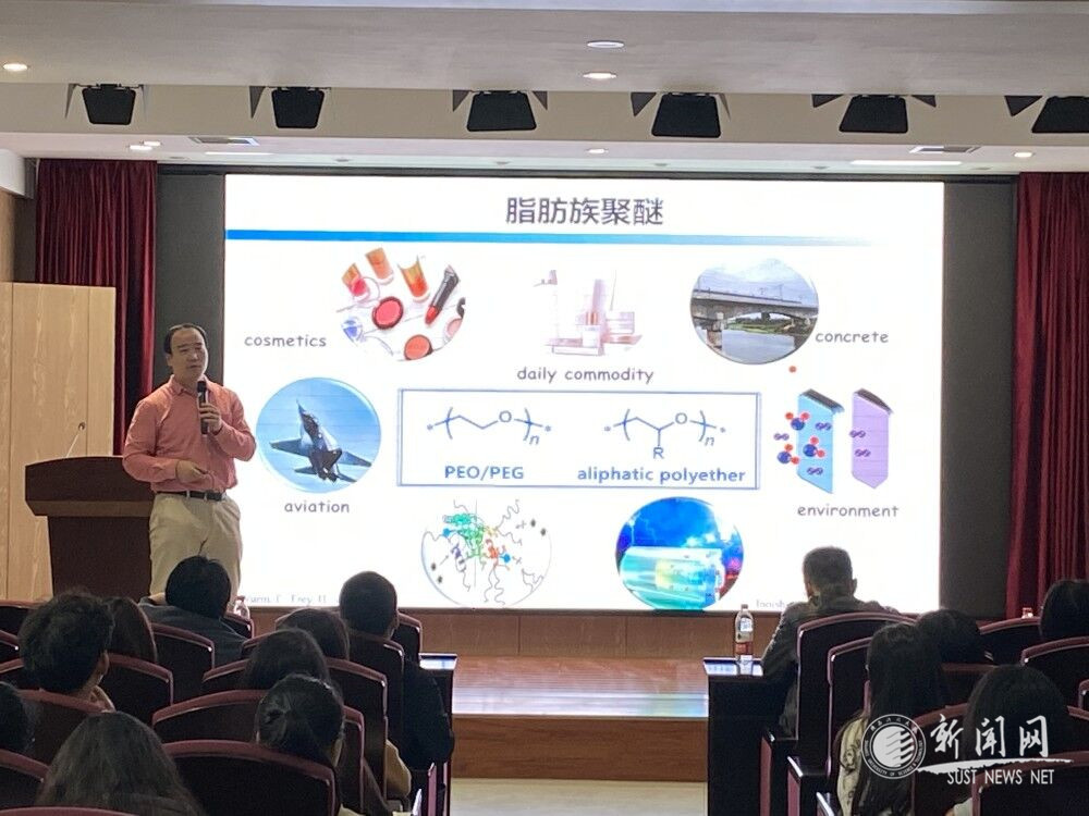 趙俊鵬教授詳細介紹了脂肪族聚醚/聚酯在有機小分子催化環(huán)氧單體/環(huán)酯單體開環(huán)聚合制備高附加值聚醚/聚酯方面的主要工作,包括基于單組分有機堿催化的環(huán)氧乙烷均聚、環(huán)氧/環(huán)酯單體的嵌段共聚、環(huán)氧/酸酐單體的交替共聚。以及基于雙組分有機Lewis酸堿對催化的環(huán)氧/環(huán)酯單體串聯(lián)共聚,環(huán)氧/環(huán)狀酸酐的序列選擇性共聚等工作。趙教授的學(xué)術(shù)報告展現(xiàn)了其對環(huán)氧化合物參與的高效聚合反應(yīng)的獨特見解,對我校師生在該領(lǐng)域及相關(guān)領(lǐng)域今后研究方向的深入與拓展具有很好的啟發(fā)性。報告結(jié)束后,他還與在座師生就報告內(nèi)容進行了深入的討論和交流。