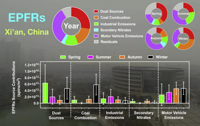 “Source apportionment of environmentally persistent free radicals (EPFRs) in PM2.5over Xi'an, China (西安市PM2.5中環(huán)境持久性自由基EPFR的來源分配)”基于化學(xué)分析和正定矩陣因子分析(PMF)報道了PM2.5中EPFR的來源。本團隊于2017年4月至12月在西安市收集每日PM2.5樣本,并對EPFR和其他化學(xué)成分進行定量分析。揭示了EPFR的五個主要來源:揚塵源、燃煤源、二次硝酸鹽、工業(yè)排放源和機動車排放源。燃煤源、機動車排放源和揚塵源是EPFR的三大貢獻者(占76%)。燃煤對PM2.5和EPFR至關(guān)重要。春季,由于沙塵暴氣象事件的發(fā)生,揚塵源對EPFR的貢獻很大。將PMF結(jié)果與氣象數(shù)據(jù)相結(jié)合后發(fā)現(xiàn),西安市中心排放的大氣污染物可以通過南風(fēng)運到采樣地點。這些結(jié)果表明需要對EPFRs的公共健康影響進行進一步研究,并可用于幫助制定污染物源頭控制措施,以減少EPFRs在PM2.5中帶來的潛在健康風(fēng)險。全文鏈接:https://doi.org/10.1016/j.scitotenv.2019.06.424