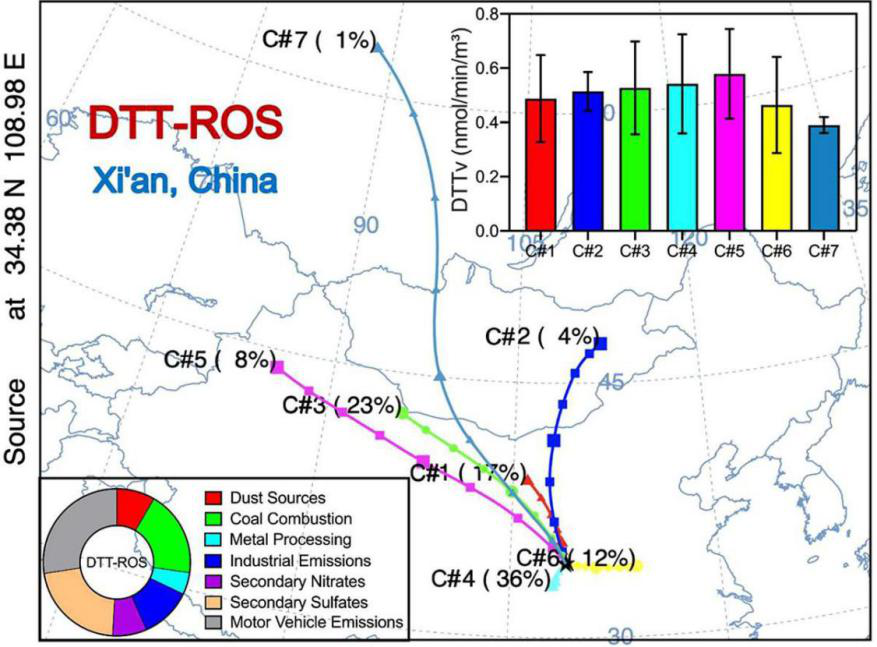 “Study on the oxidation potential of the water-soluble components of ambient PM2.5over Xi'an, China: Pollution levels, source apportionment and transport pathways (西安市環(huán)境PM2.5水溶性組分的氧化潛能研究:污染水平,污染源分配和運輸途徑)”以被認為是對人體造成不利影響的大氣顆粒物中的活性氧(ROS)為背景,采用DTT方法測量了2017年在西安市采集的116個日細顆粒物樣品中的ROS水平,并對大氣顆粒物中ROS的來源進行定量分析。結(jié)果表明,西安市ROS產(chǎn)生水平最高水平發(fā)生在冬季,其次是春季,夏季和秋季。PMF的源解析結(jié)果顯示,PM2.5中ROS主要貢獻源來自機動車排放物、二次硫酸鹽和燃煤源。后向軌跡聚類分析表明,主要的聚類群是本地和區(qū)域運輸,而西安上空PM2.5的氧化潛能受遠程運輸?shù)挠绊懘笥谑鼙镜剡\輸?shù)挠绊憽H缟纤?,提高大氣氧化潛力不僅需要區(qū)域性努力,還需要大規(guī)模的聯(lián)合合作。此外,這項關(guān)于大氣顆粒物的氧化潛能的研究以及具體的來源信息為健康效應(yīng)研究提供了重要的指導(dǎo)。全文鏈接:https://doi.org/10.1016/j.envint.2020.105515