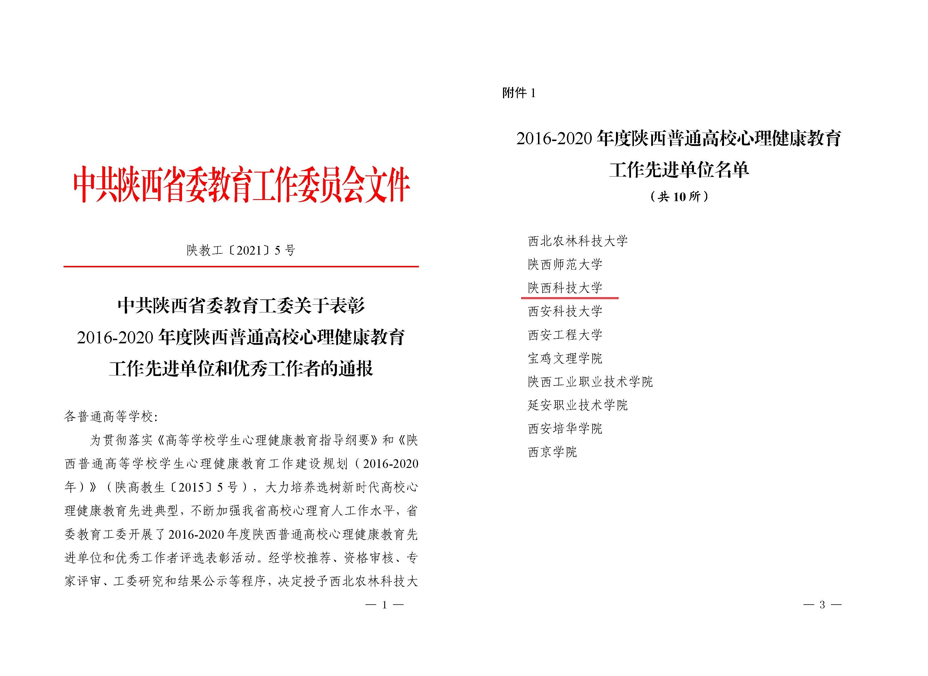 日前,陜西省委教育工委發(fā)文,對2016-2020年度陜西普通高校心理健康教育先進單位和優(yōu)秀工作者進行通報表彰。我校等10所高校被授予“2016-2020年度陜西普通高校心理健康教育工作先進單位”榮譽稱號,王慧芳等60位教師被評為“2016-2020年度陜西普通高校心理健康教育優(yōu)秀工作者”。
