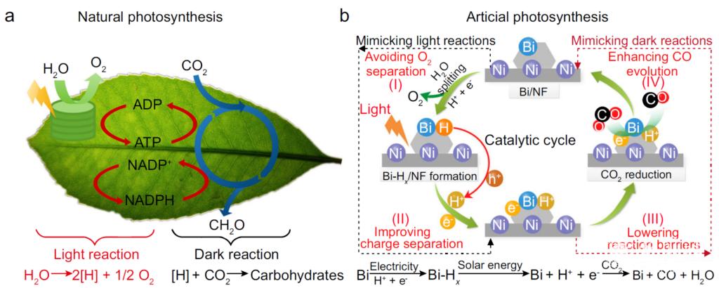 在趙進才院士工作室的支持下,我校李英宣教授在光催化還原CO2研究領(lǐng)域連續(xù)取得重要進展。繼實現(xiàn)金屬Bi制備和相變機制研究后(Nature Communications 2017, 8, 14462),利用金屬Bi等離子體光催化劑實現(xiàn)了自然界植物光合作用中水氧化和CO2還原復(fù)雜反應(yīng)過程全模擬,相關(guān)成果再一次發(fā)表在Nature子刊《自然-通訊》(Nature Communications)上,該成果我校為第一單位,李英宣教授為第一作者,李英宣教授和中科院長春應(yīng)化所王穎副研究員為共同通訊作者,2018級碩士研究生惠丹屏為第二作者。這是李英宣教授在Angew. Chem. Int. Ed.、Environ. Sci. & Technol.等自然指數(shù)期刊發(fā)表論文之后,在光催化還原CO2研究方面取得的又一重要成果。