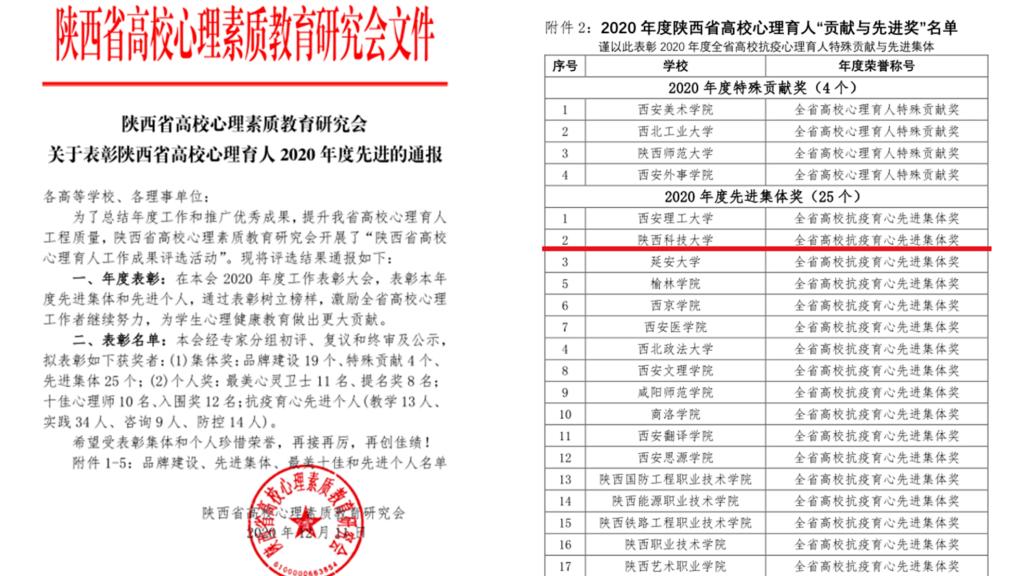 近日,由陜西省高校心理素質(zhì)教育研究會主辦的2020年度陜西省高校心理育人工作成果評選活動、第五屆陜西省高校百家慕課心理育人作品大賽獲獎結(jié)果公布,我校選送的3項教師作品、32項學生作品均獲佳績,其中特等獎4項,金獎7項,我校榮獲2020年度“全省高??挂哂南冗M集體獎”、“陜西高??挂咝睦碚{(diào)研大數(shù)據(jù)分析”優(yōu)秀組織獎。