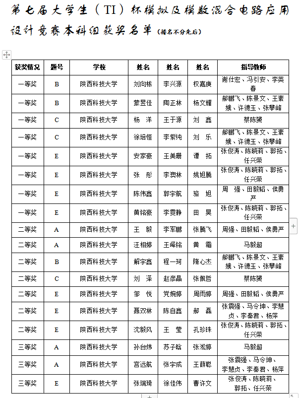 1月7日,第七屆全國大學(xué)生電子設(shè)計競賽暨(TI)杯模擬及模數(shù)混合電路應(yīng)用設(shè)計競賽成績揭曉,我校共有22支學(xué)生隊參賽,獲得一等獎8項,二等獎7項,三等獎3項,獲獎率81.8%,一等獎率36.4%,參賽隊數(shù)、獲獎率和獲獎質(zhì)量再創(chuàng)歷史新高,在陜西省56所院校的823個參賽隊的本科組中,成績排名第二,學(xué)校被組委會評為陜西省“優(yōu)秀組織單位”,張攀峰老師獲得優(yōu)秀組織獎。