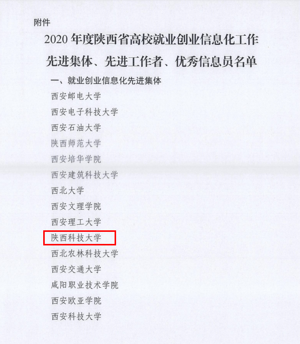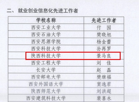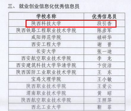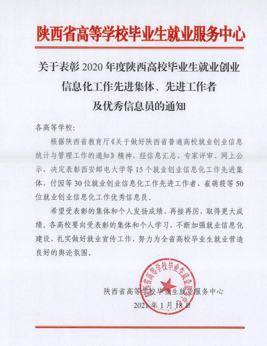 近日,2020年度陜西高校就業(yè)創(chuàng)業(yè)信息化工作先進集體和個人表彰名單出爐。我校再次獲評陜西高校就業(yè)創(chuàng)業(yè)信息化工作先進集體,景馬良、段引香分別獲評全省高校就業(yè)創(chuàng)業(yè)信息化工作“先進工作者”“優(yōu)秀信息員”。