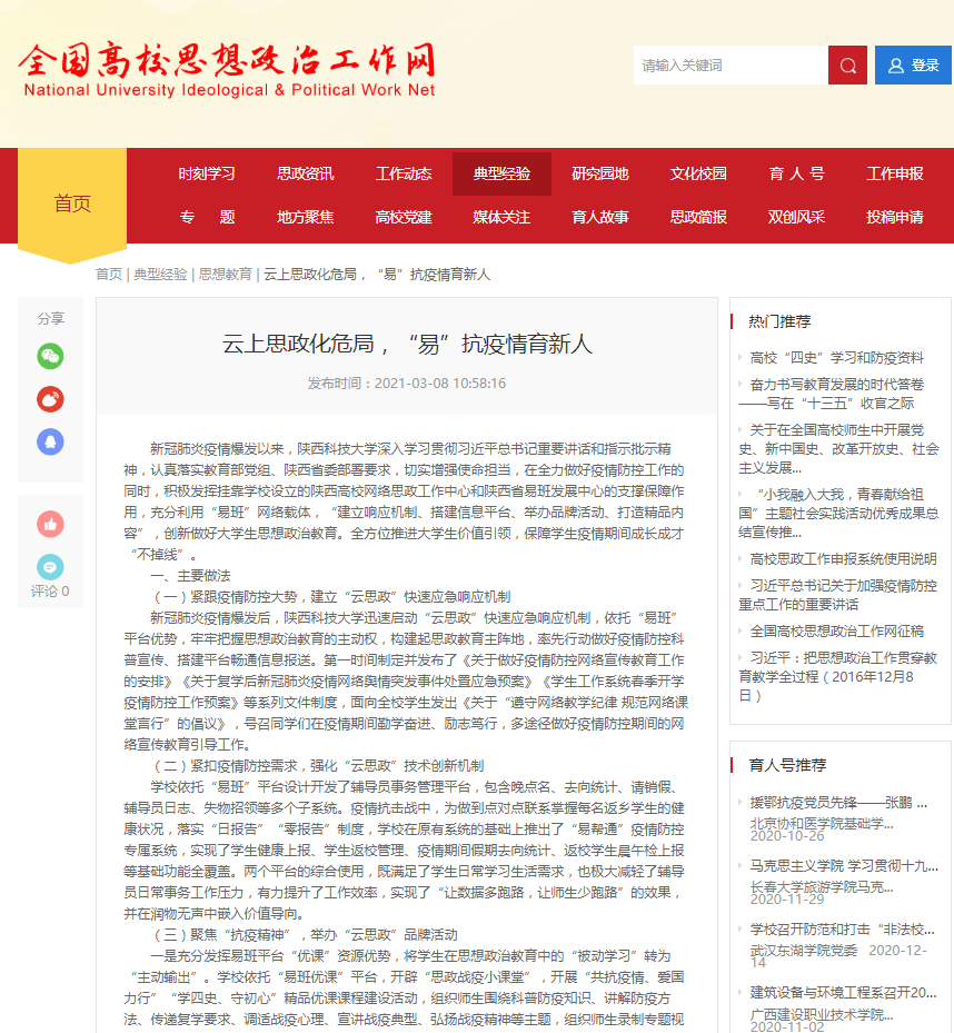 3月8日,全國高校思想政治工作網(wǎng)的“典型經(jīng)驗(yàn)”版塊刊載我?!对粕纤颊>郑耙住笨挂咔橛氯恕兾骺萍即髮W(xué)依托“易班”平臺,打造戰(zhàn)“疫”云思政》工作案例,受到全國高校的廣泛關(guān)注。