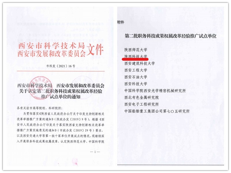 近日,西安市科技局、西安市發(fā)展改革委員會公布了《關于認定第二批職務科技成果權屬改革經(jīng)驗推廣試點單位的通知》(市科發(fā)[2021] 16號),我校成功獲批。