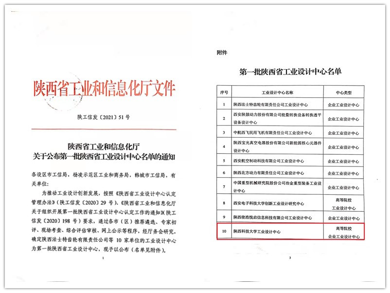 近日,我?!瓣兾骺萍即髮W(xué)工業(yè)設(shè)計(jì)中心”獲得陜西省工業(yè)和信息化廳第一批省級(jí)工業(yè)設(shè)計(jì)中心認(rèn)定。
