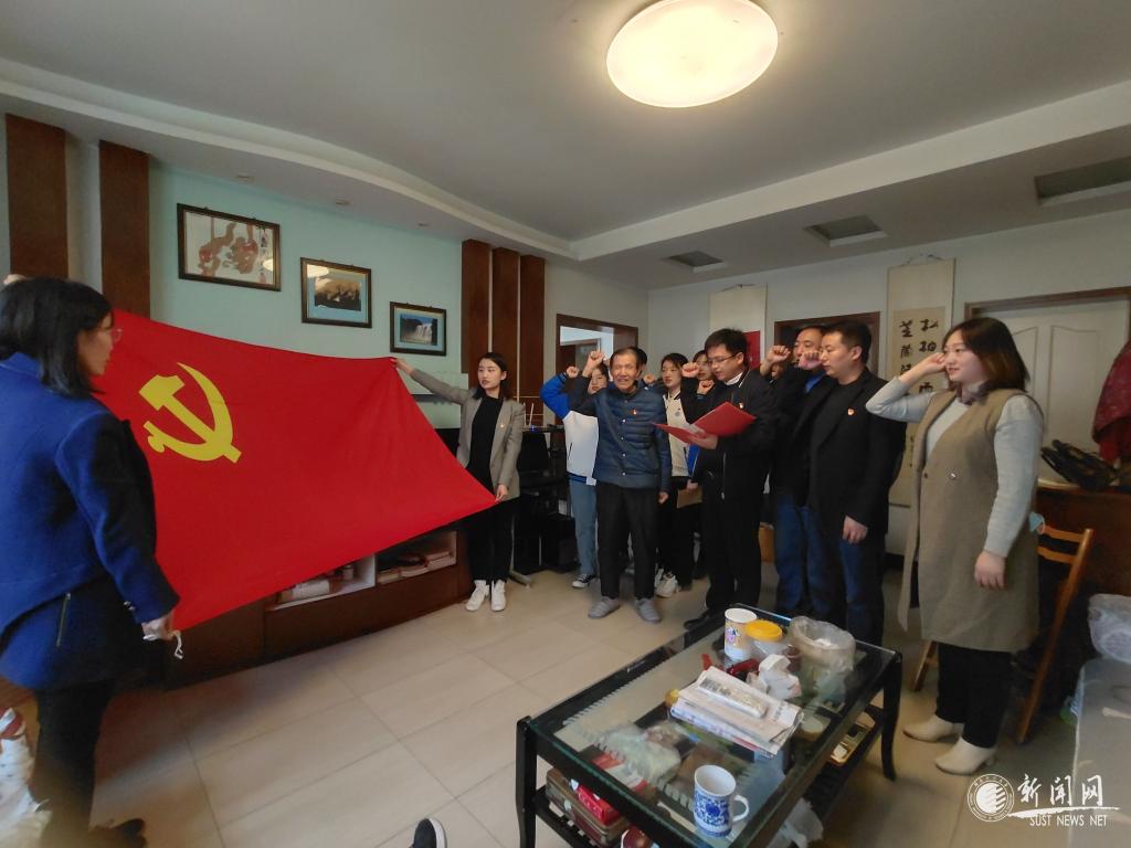 最震撼人心的一幕,當(dāng)黨旗展開(kāi)的瞬間,正在輪椅上跟青年黨員親切交流的鞠文山立刻抬起頭挺直腰板,顫顫巍巍的舉起右手,向黨旗敬軍禮并高呼“共產(chǎn)黨萬(wàn)歲”,堅(jiān)定的眼神閃耀著光芒,手許久都不肯放下,如山一般的姿勢(shì),這就是烙在心里永不磨滅的紅色信仰的力量。這種深入骨髓、融入血液的對(duì)共產(chǎn)主義的信仰、對(duì)黨的忠誠(chéng),深深地震撼了在場(chǎng)所有人的心靈,高舉的黨旗、行軍禮的鞠文山、淚光閃閃的青年黨員、瞬間安靜的現(xiàn)場(chǎng),孱弱的身軀、堅(jiān)定的信仰形成的巨大反差,這一幕給人帶來(lái)的感動(dòng)用任何文字來(lái)形容都是蒼白的,以至于大家都停下了動(dòng)作,忘記了自己要做什么,時(shí)間瞬間定格,一位想找老人合影的學(xué)生滿含淚水從背后拍下珍貴的照片。