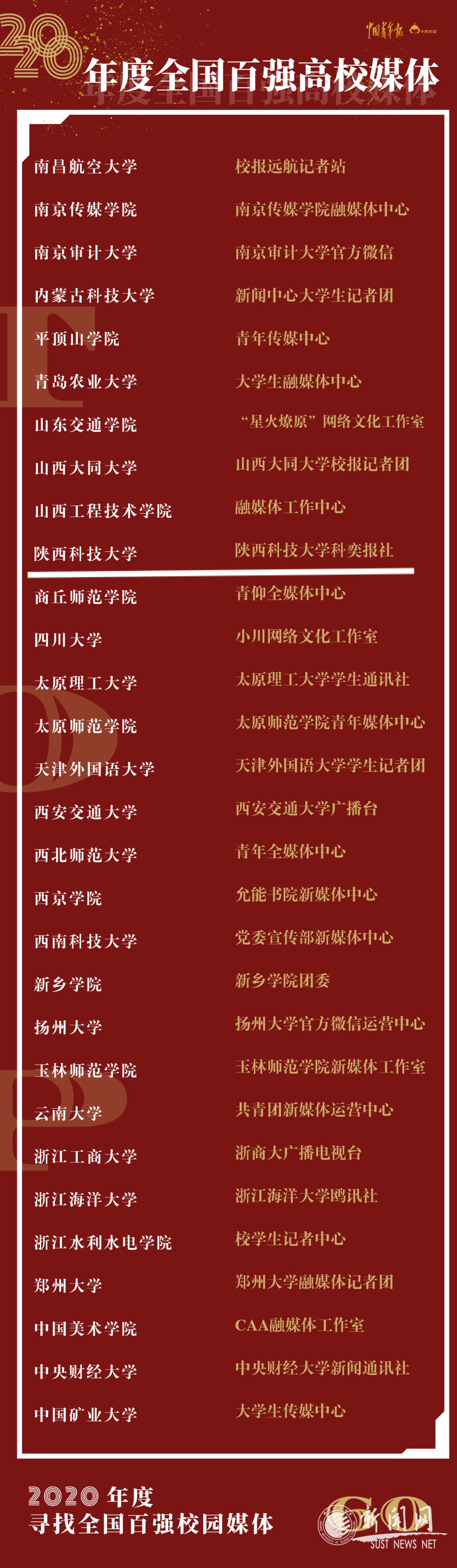 “尋找全國百強(qiáng)校媒”活動是中國青年報(bào)社、中青校媒為鼓勵(lì)校園媒體和校園媒體人,幫助校園媒體更好地服務(wù)大學(xué)生,自2015年起策劃舉辦的“高校新聞扶持計(jì)劃”。2020年,中國青年報(bào)社、中國青少年新媒體協(xié)會、中青校媒聯(lián)合舉辦“高校新聞扶持計(jì)劃”——“尋找全國百強(qiáng)校媒”,通過校園影響力(35%)、品牌活動(20%)、優(yōu)質(zhì)內(nèi)容(45%)等指標(biāo)綜合評比,經(jīng)過初審、復(fù)審、終審,綜合省份、WCI(微信傳播指數(shù))、發(fā)展力等評選標(biāo)準(zhǔn),最終在本科高校中評選出全國十佳高校媒體、全國優(yōu)秀高校媒體、全國百強(qiáng)高校媒體。其中,共評選出60家全國百強(qiáng)高校媒體,我?!犊妻取穲?bào)社榮獲“全國百強(qiáng)高校媒體”稱號。