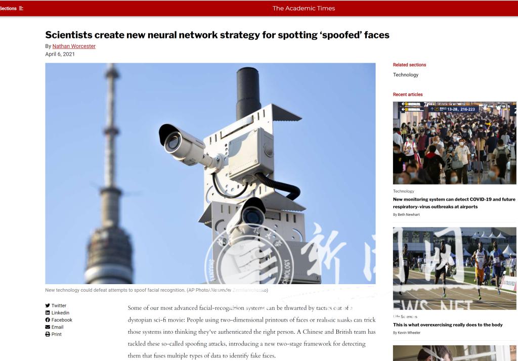 近日,英國主流媒體Academic Times在先進技術(shù)欄目中刊登了“Scientists create new neural network strategy for spotting ‘spoofed’ faces”一文,該媒體聲稱當前最為先進的人臉識別系統(tǒng)面臨3D人臉硅膠和2D照片欺騙的威脅,來自中國陜西科技大學(電智學院雷濤教授)和英國Brunel University London(電氣與電子工程學院Asoke K. Nandi院士)的研究團隊利用多模態(tài)數(shù)據(jù)構(gòu)建二階深度神經(jīng)網(wǎng)絡(luò),成功解決了這一難題,該模型在多個主流的3D人臉數(shù)據(jù)庫上測試,平均識別率超過97%,研究成果發(fā)表在國際權(quán)威期刊IEEE Transactions on Cognitive and Developmental Systems,該成果由國家自然科學基金委與英國皇家學會國際合作交流項目資助。