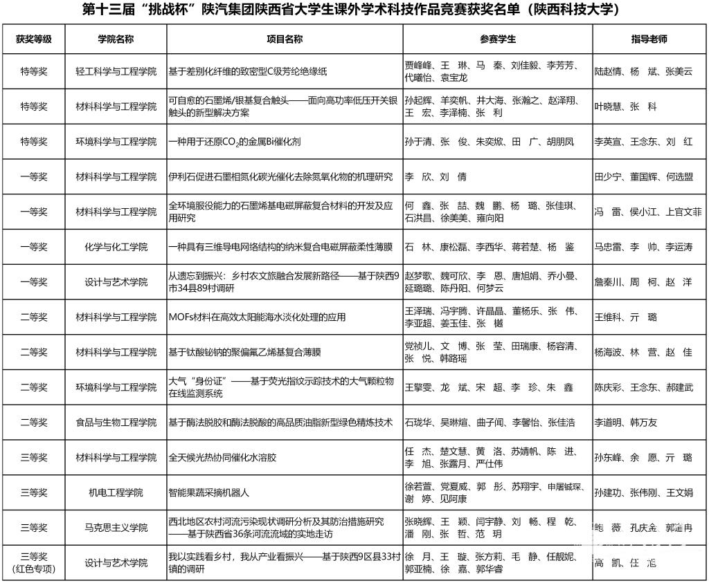 其中,輕工科學與工程學院《基于差別化纖維的致密型C級芳綸絕緣紙》、材料科學與工程學院《可自愈的石墨烯/銀基復合觸頭——面向高功率低壓開關銀觸頭的新型解決方案》、環(huán)境科學與工程學院《一種用于還原CO2的金屬Bi催化劑》3件作品榮獲特等獎;化學與化工學院《一種具有三維導電網(wǎng)絡結構的納米復合電磁屏蔽柔性薄膜》、設計與藝術學院《從遺忘到振興:鄉(xiāng)村農(nóng)文旅融合發(fā)展新路徑——基于陜西9市34縣89村調研》等4件作品獲得一等獎;食品與生物工程學院《基于酶法脫膠和酶法脫酸的高品質油脂新型綠色精煉技術》、材料科學與工程學院《伊利石促進石墨相氮化碳光催化去除氮氧化物的機理研究》等4件作品獲得二等獎;機電工程學院《智能果蔬采摘機器人》、馬克思主義學院《西北地區(qū)農(nóng)村河流污染現(xiàn)狀調研分析及其防治措施研究——基于陜西省36條河流流域的實地走訪》等4件作品獲得三等獎。