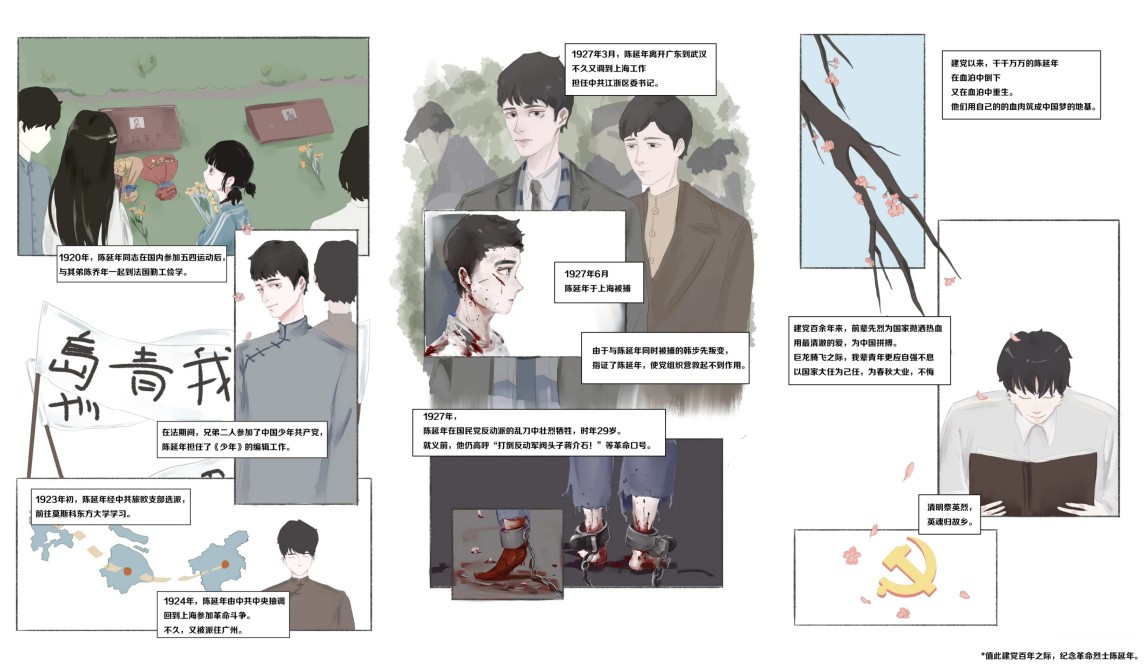 設(shè)計與藝術(shù)學(xué)院“追尋紅色記憶,傳承紅色基因”。設(shè)藝學(xué)院黨史學(xué)習(xí)教育以網(wǎng)絡(luò)文化作品創(chuàng)作為載體,依托線上網(wǎng)絡(luò)平臺,充分發(fā)揮學(xué)科特長,采取條漫、微課、影評、講解、改編歌曲等豐富形式,發(fā)揮好思政工作主陣地、網(wǎng)絡(luò)空間主平臺、研學(xué)實踐大課堂的作用,引導(dǎo)廣大師生追尋紅色記憶,傳承紅色基因。從“小切口”“小故事”出發(fā),結(jié)合電視劇《覺醒年代》的熱播,學(xué)院易班工作站制作條漫《清明祭·英雄魂》,通過手繪革命先烈陳延年的英雄事跡,用圖像話語傳遞英雄精神。組織學(xué)生黨員、學(xué)生骨干等參觀走訪西安事變紀(jì)念館、大華1935博物館、梁家河、楊家?guī)X、棗園、洛川會議舊址、路遙故居、中國輕工業(yè)博物館等愛國主義教育基地,黨員同志進(jìn)行現(xiàn)場教學(xué)的同時,“青年講師團(tuán)”現(xiàn)場錄制了一系列學(xué)習(xí)教育視頻并上線易班優(yōu)課。