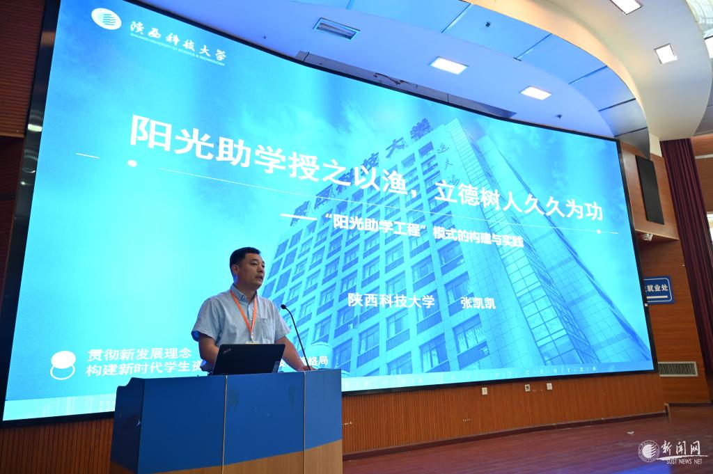 張凱凱以《陽光助學授之以漁立德樹人久久為功——陜西科技大學陽光助學工程的構建與實踐》為題,進行發(fā)言。他圍繞學校“陽光助學工程”資助育人體系的構建與實踐探索,詳細介紹了我校將“人才培養(yǎng)模式改革”“創(chuàng)業(yè)實踐基地建設”“捐助扶持制度建設”“精神資助體系構建”作為突破口,推出能力提升計劃,建設六大經(jīng)濟實體,設立三大助學基金,構建一體化陽光精神資助體系的工作模式。