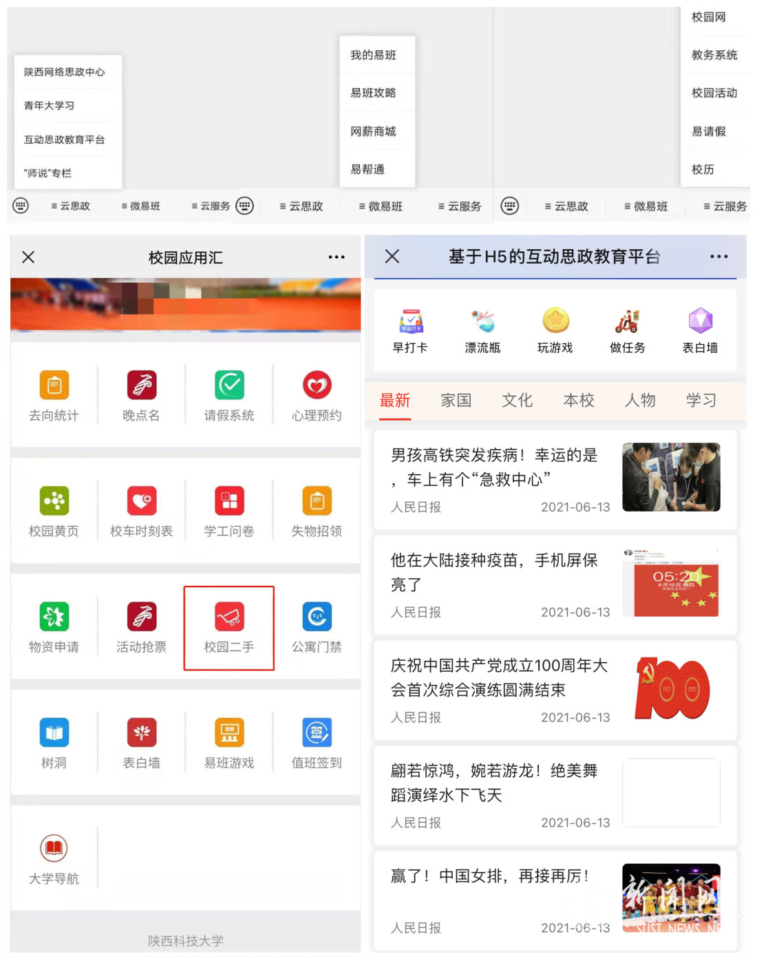 該服務號集合易班內容、大學生思想政治教育、學生服務等功能,有效避免學生需登陸多個APP實現(xiàn)功能切換、易班卡頓閃退等問題,同時也將成為學生參加易班活動、了解學校資訊、服務學生日常學習生活的重要載體,并實現(xiàn)重要信息的定點推送功能。目前,“SUST云科大”分為三個模板,即云思政、微易班、云服務。包含優(yōu)質網(wǎng)絡思政教育內容、疫情晨午檢打卡、易請假、教務系統(tǒng)、青年大學習、科大校園網(wǎng)、校歷查詢等多項功能。