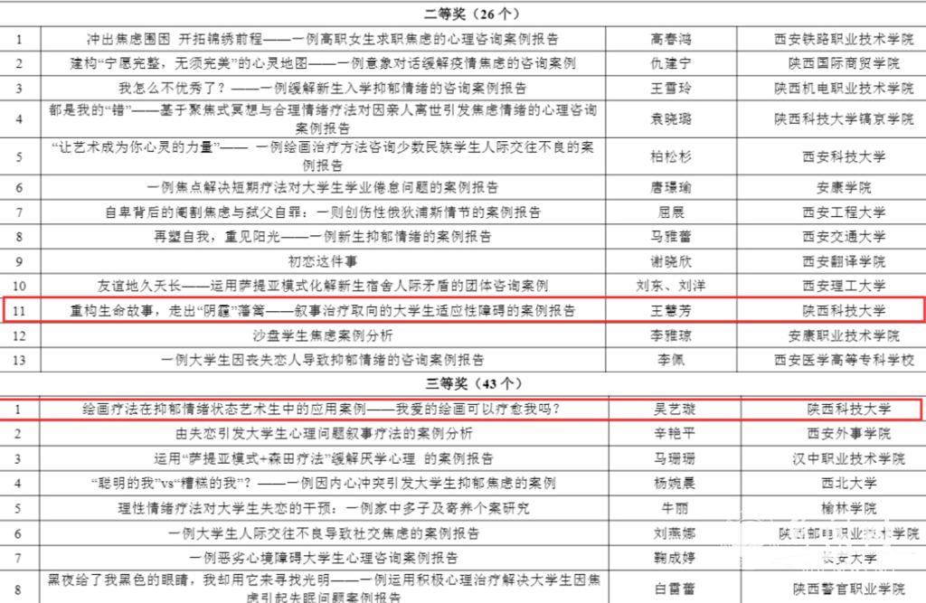 學(xué)工部心理中心教師王慧芳的咨詢案例《重構(gòu)生命故事,走出“陰霾”藩籬——敘事治療取向的大學(xué)生適應(yīng)性障礙的案例報(bào)告》榮獲陜西高校第七屆心理健康教育優(yōu)秀咨詢案例二等獎(jiǎng),通過敘事療法幫助學(xué)生適應(yīng)大學(xué)生活,重獲自信。設(shè)計(jì)與藝術(shù)學(xué)院輔導(dǎo)員吳藝璇的咨詢案例《繪畫療法在抑郁情緒狀態(tài)藝術(shù)生中的應(yīng)用案例——我愛的繪畫可以療愈我嗎?》榮獲三等獎(jiǎng),運(yùn)用繪畫藝術(shù)表達(dá)引導(dǎo)學(xué)生表達(dá)情感,健全人格。