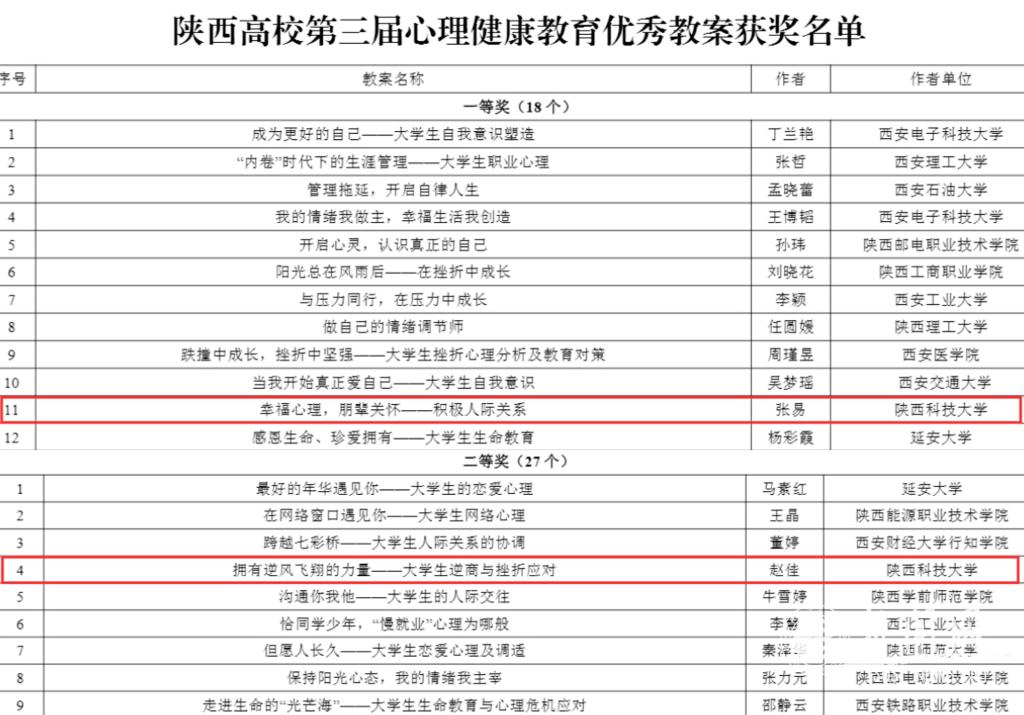 學(xué)工部心理中心教師張易的心理教案《幸福心理,朋輩關(guān)懷——積極人際關(guān)系》榮獲陜西高校第三屆心理健康教育優(yōu)秀教案一等獎(jiǎng),該作品引導(dǎo)學(xué)生運(yùn)用贊美、積極評論、共情技術(shù)營造良好的人際關(guān)系。材料科學(xué)與工程學(xué)院輔導(dǎo)員趙佳的心理教案《擁有逆風(fēng)飛翔的力量——大學(xué)生逆商與挫折應(yīng)對》榮獲二等獎(jiǎng),關(guān)注大學(xué)生挫折應(yīng)對與逆商培養(yǎng),引導(dǎo)學(xué)生正視挫折。