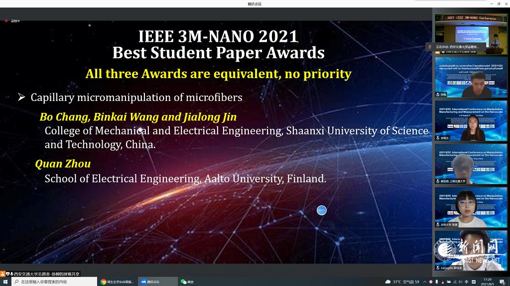 會(huì)議期間,我校師生和國(guó)內(nèi)外專(zhuān)家在線進(jìn)行了充分的交流與探討,來(lái)自世界各地的專(zhuān)家學(xué)者對(duì)我校在微納操作領(lǐng)域的工作給予了高度評(píng)價(jià)。此次獲獎(jiǎng)對(duì)提高我校在微納米操作領(lǐng)域國(guó)內(nèi)外影響力、激勵(lì)研究生參與國(guó)際學(xué)術(shù)交流起到了積極的推動(dòng)作用。