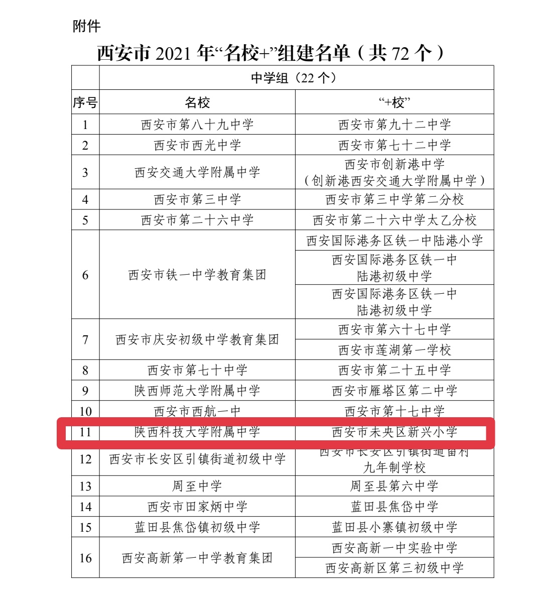 按照西安市委、市政府加快新時(shí)代教育改革發(fā)展,建設(shè)教育強(qiáng)市的部署和要求,為加快推進(jìn)我市基礎(chǔ)教育優(yōu)質(zhì)均衡發(fā)展,辦好人民滿(mǎn)意的西安教育。2020年8月,名校“陜西科技大學(xué)附屬中學(xué)”與+?!拔囱?yún)^(qū)新興小學(xué)”組建了區(qū)級(jí)緊湊型“名校+”教育聯(lián)合體。2021年,西安市教育局決定在區(qū)級(jí)“名校+”中擇優(yōu)選拔組建市級(jí)“名校+”。
