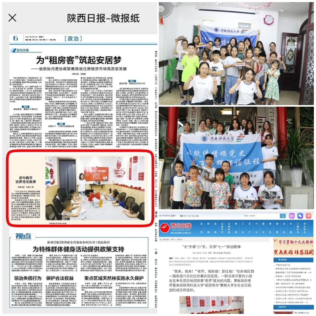 “紙因有你”建黨100周年青年踐學(xué)獻(xiàn)禮實(shí)踐團(tuán)圍繞紅船上的中共一大、新中國(guó)第一輛汽車誕生、2003年神舟五號(hào)載人飛船升空和2021年慶祝中國(guó)共產(chǎn)黨成立100周年等四個(gè)重大事件進(jìn)行創(chuàng)作,設(shè)計(jì)系列紅色黨史宣講課程,把黨史故事講生動(dòng)。于7月25-28日前往西安市新城區(qū)西一路街道興樂(lè)社區(qū)和觀點(diǎn)學(xué)子之家,服務(wù)社區(qū),幫助小朋友厚植愛(ài)黨、愛(ài)國(guó)情感,并得到《陜西日?qǐng)?bào)》、《西北在線》等平臺(tái)報(bào)道。