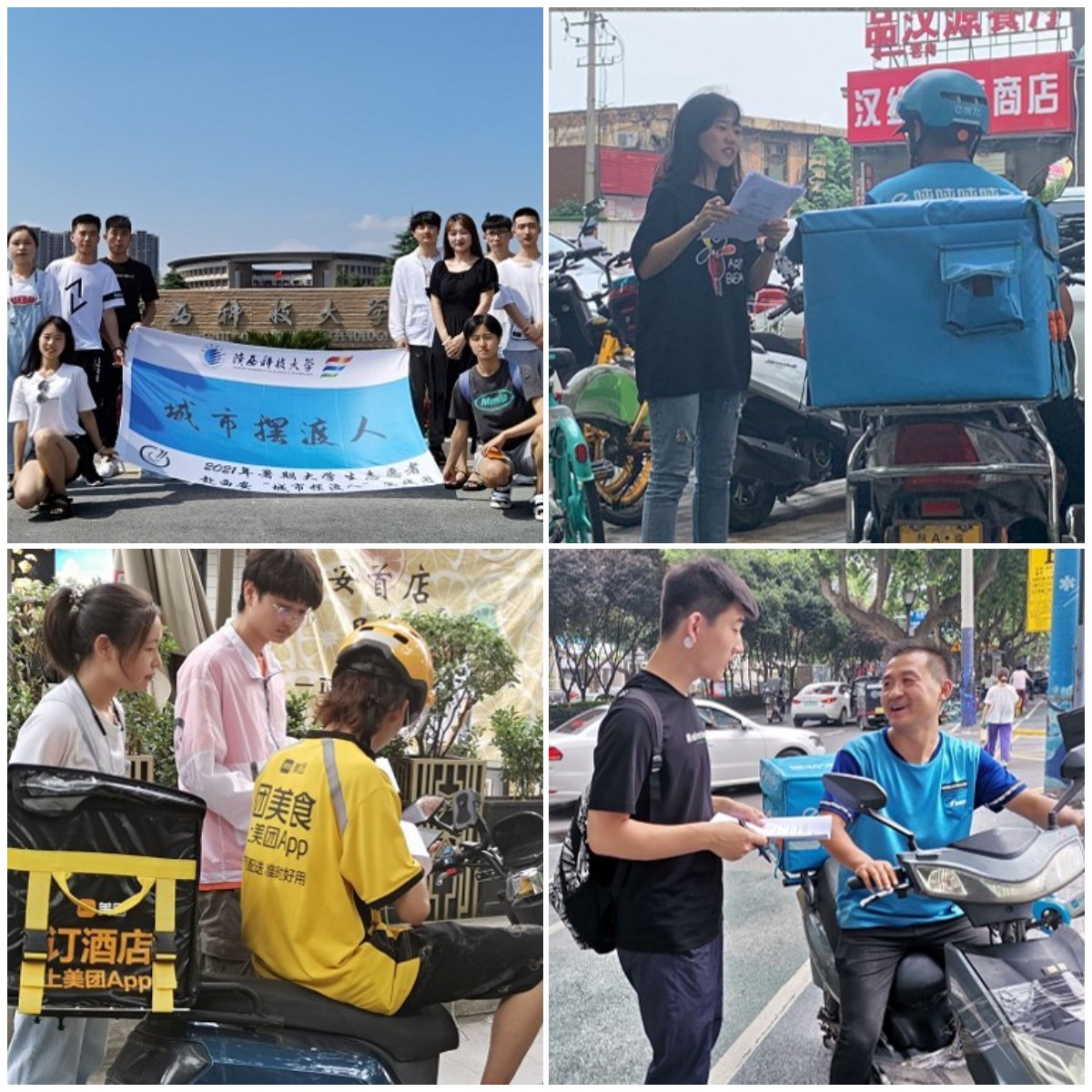 “城市擺渡人”實(shí)踐團(tuán)聚焦于以外賣小哥為代表的非技能化工作群體,前往未央?yún)^(qū)、雁塔區(qū)等地,實(shí)地調(diào)研外賣小哥的工作現(xiàn)狀以及外賣行業(yè)現(xiàn)狀,結(jié)合專業(yè)優(yōu)勢(shì),構(gòu)建數(shù)學(xué)模型,通過(guò)對(duì)調(diào)查結(jié)果的分析以及數(shù)學(xué)模型的解析,共同探索非技能群體的未來(lái)職業(yè)發(fā)展與轉(zhuǎn)型問(wèn)題。