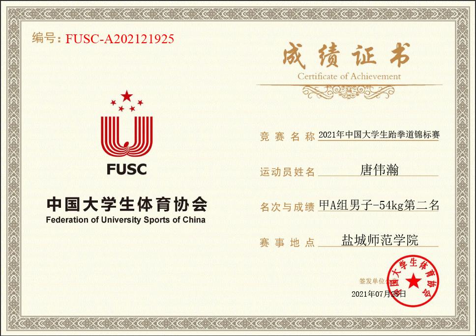 近日,我校跆拳道代表隊斬獲2021年中國大學生跆拳道錦標賽高校甲A組男子54kg級第二名。