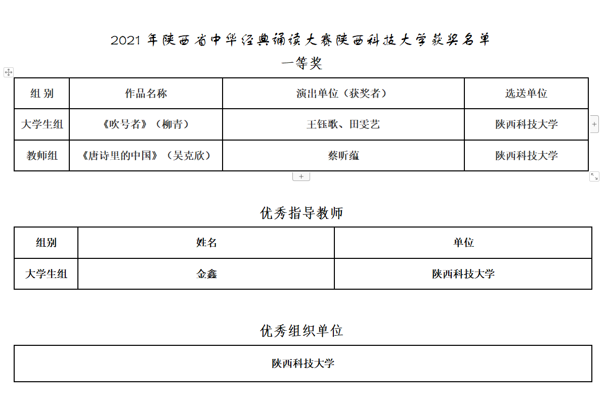 陜西省第三屆中華經(jīng)典誦寫講大賽經(jīng)各校推薦、專家評(píng)審等環(huán)節(jié),共評(píng)選出一等獎(jiǎng)31個(gè)、二等獎(jiǎng)48個(gè)、三等獎(jiǎng)64個(gè)、優(yōu)秀指導(dǎo)教師29名、優(yōu)秀組織單位42個(gè)。