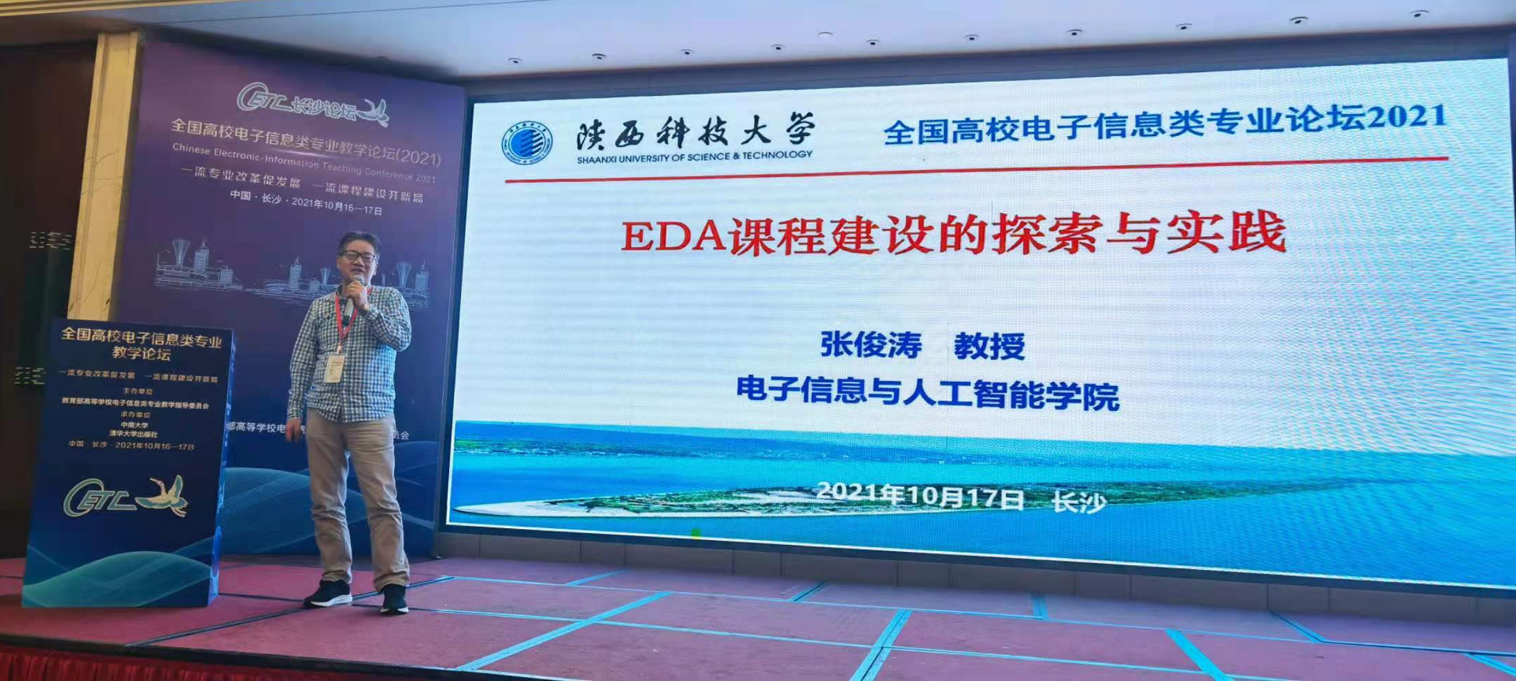 10月16日、17日,2021年全國高校電子信息類專業(yè)教學(xué)論壇在長(zhǎng)沙召開,我校電子信息與人工智能學(xué)院張俊濤教授受論壇會(huì)務(wù)組邀請(qǐng),作為演講嘉賓,在論壇上發(fā)表以“EDA課程建設(shè)的探索和實(shí)踐”為主題的報(bào)告。