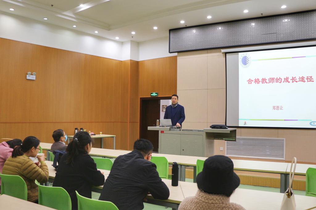 鄭恩讓教授以《合格教師的成長途徑》為題,圍繞教師的職責(zé)、基本素養(yǎng)及對(duì)教學(xué)的建議幾個(gè)方面,將自身多年摸索總結(jié)的教學(xué)理念、管理經(jīng)驗(yàn)毫無保留的傳授給在場(chǎng)老師。他強(qiáng)調(diào)“身教重于言傳,要以自身行為影響學(xué)習(xí),真正成為學(xué)生的表率”。他將教學(xué)理論融于信手拈來的鮮活實(shí)例之中,將授課方法以觀摩示范的形式展示給青年教師,讓青年教師們體會(huì)教學(xué)是一門包含“策劃、編劇、導(dǎo)演、演員、評(píng)論”的藝術(shù)、講稿是對(duì)教材內(nèi)容的再創(chuàng)作,感悟“教無定法,無法勝有法”的教法精髓。生動(dòng)而有信服力的授課方式和豐富的肢體語言很好的詮釋了自身教學(xué)理念。培訓(xùn)后,鄭教授還以將一些教學(xué)中的心得體會(huì)以聊天談心的方式與青年教師們進(jìn)行了分享。