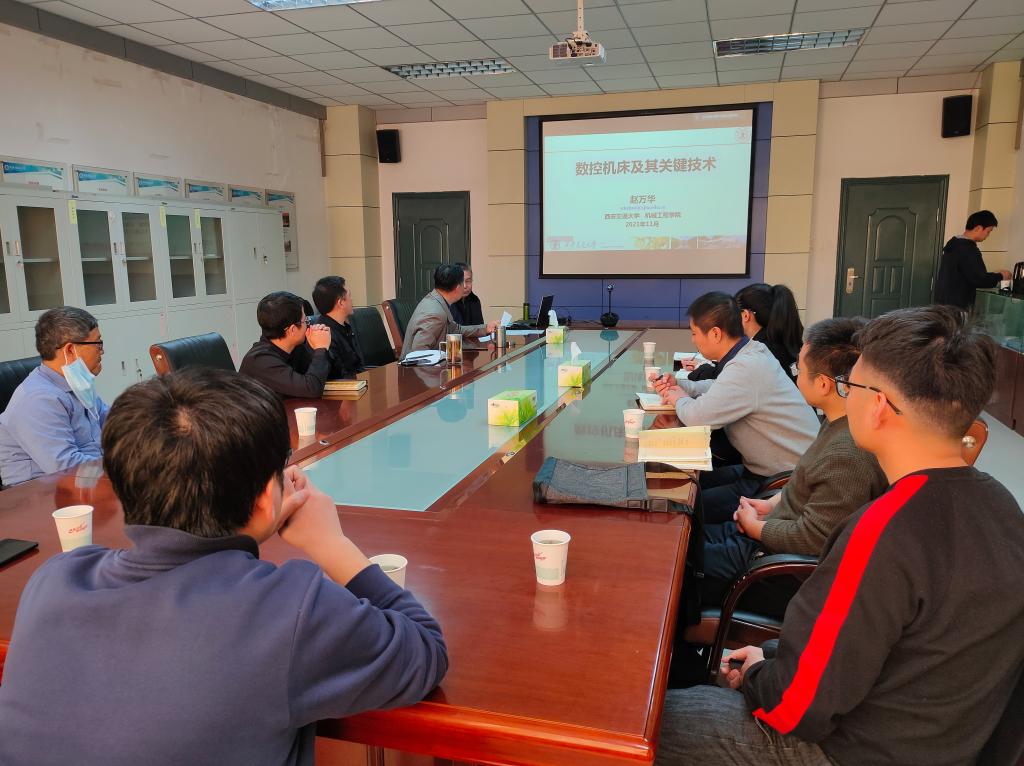 為了進(jìn)一步提升教師教學(xué)科研水平,積極推動(dòng)“數(shù)控機(jī)床重點(diǎn)產(chǎn)業(yè)鏈”在機(jī)電工程學(xué)院的布局和發(fā)展,11月25日下午,應(yīng)科技處及機(jī)電學(xué)院邀請(qǐng),數(shù)控機(jī)床領(lǐng)域?qū)<?、西安交通大學(xué)趙萬華教授做客我?!扒把乜茖W(xué)報(bào)告”,作了題為“數(shù)控機(jī)床及其關(guān)鍵技術(shù)”的前沿科學(xué)報(bào)告。報(bào)告會(huì)采用線上與線下相結(jié)合方式,機(jī)電工程學(xué)院院長(zhǎng)葛正浩主持,副院長(zhǎng)楊立軍、學(xué)院青年教師和學(xué)術(shù)骨干聆聽了本次報(bào)告。