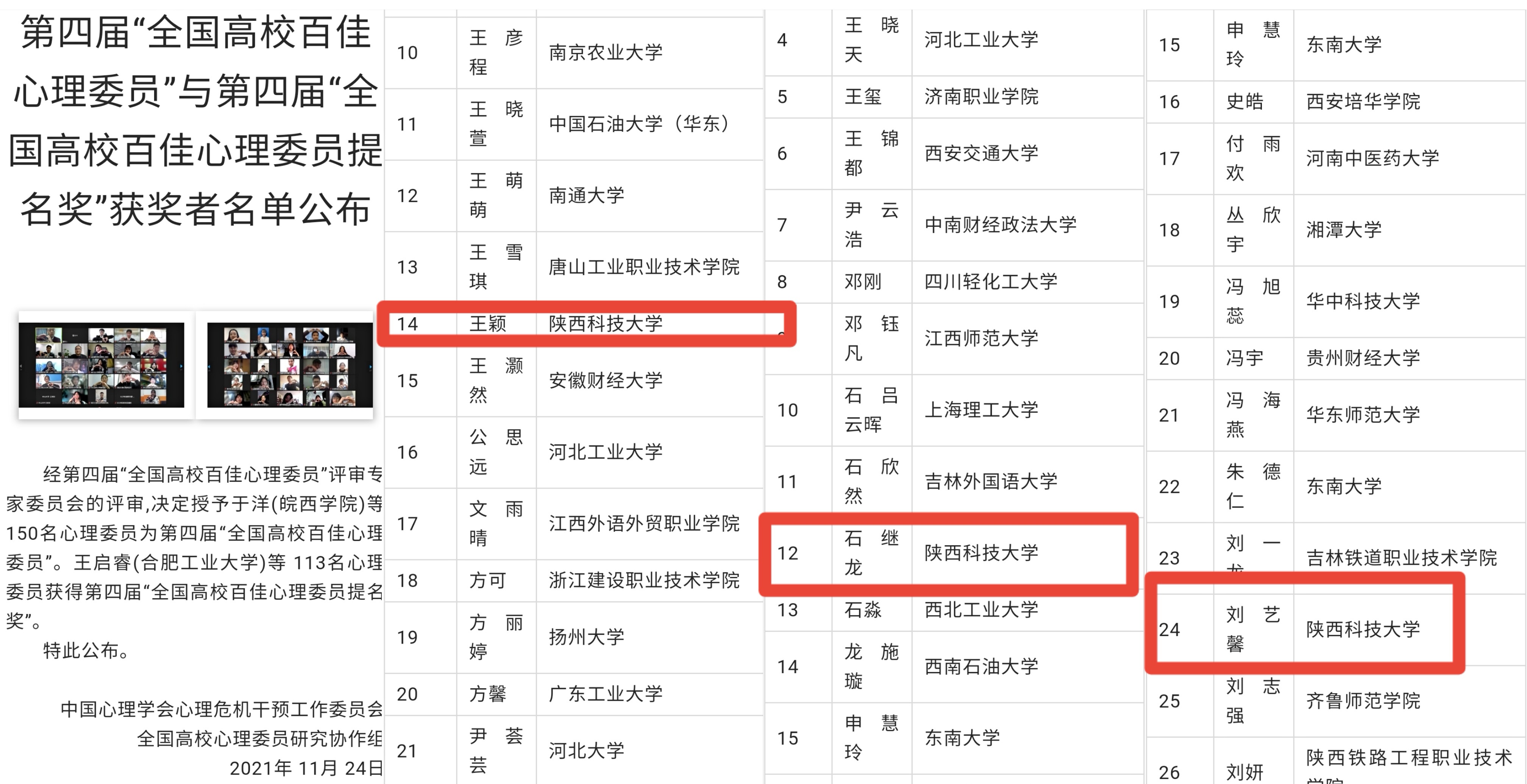 11月24日,由中國心理學(xué)會危機干預(yù)委員會主辦的第十六屆全國高校心理委員工作研討會暨朋輩心理輔導(dǎo)論壇以線上線下共同開展的方式舉辦,評選了“第四屆全國高校百佳心理委員”。我校食品與生物工程學(xué)院教改食品19班王穎榮獲“全國高校百佳心理委員”,電子信息與人工智能學(xué)院網(wǎng)絡(luò)192班石繼龍、電氣與控制工程學(xué)院電氣191班劉藝馨榮獲“全國高校百佳心理委員提名獎”。