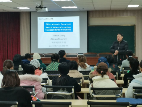 11月27日上午,應(yīng)數(shù)學(xué)與數(shù)據(jù)科學(xué)學(xué)院邀請,四川大學(xué)張偉年教授做客我?!扒把乜茖W(xué)報告”,作了題目為“Bifurcations in Recurrent Neural Network Involving Transcendental Functions”的學(xué)術(shù)報告。報告由數(shù)學(xué)學(xué)院院長藺小林主持,學(xué)院部分教師及相關(guān)專業(yè)的研究生認(rèn)真聆聽了此次報告。