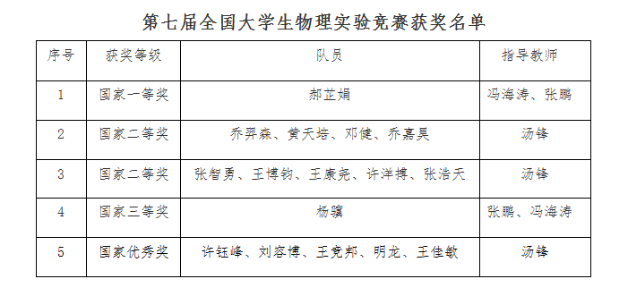 近日,第七屆全國大學(xué)生物理實(shí)驗(yàn)競賽在南昌大學(xué)落幕。我校獲國家一等獎1項(xiàng)、二等獎2項(xiàng)、三等獎1項(xiàng)、優(yōu)秀獎1項(xiàng),我校是唯一獲得國家一等獎的陜西省屬高校。