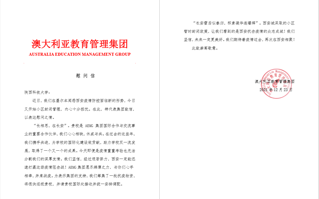 疫情牽動(dòng)人心,支援驅(qū)散嚴(yán)寒。在我校嚴(yán)格落實(shí)陜西省新冠肺炎疫情防控要求、積極抗疫之初,澳大利亞教育管理集團(tuán)(AEMG)第一時(shí)間向我校發(fā)來(lái)慰問信,表達(dá)關(guān)心與惦念,此次又向我校捐贈(zèng)一批防疫物資30余箱。