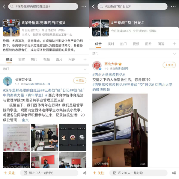 小話題閃耀青春光芒。此次活動(dòng)的“高校青年戰(zhàn)‘疫’日記”篇章,以微博為平臺(tái)進(jìn)行聯(lián)動(dòng),目前發(fā)起的#深冬里那亮眼的白紅藍(lán)#、#戰(zhàn)“疫”中的秦青力量#、#三秦戰(zhàn)“疫”日記#等話題,已吸引全省60余所高校廣師生參與討論與傳播,話題累計(jì)閱讀量超過(guò)585萬(wàn)次。比如,我校學(xué)生在話題中寫(xiě)下自己的心路歷程:“追著光,靠近光,成為光,散發(fā)光?!辈⑴渖狭俗约荷泶┓雷o(hù)服協(xié)助學(xué)校開(kāi)展核酸檢測(cè)的照片。西安建筑科技大學(xué)學(xué)生拍攝下志愿者們?cè)诖笱┲兴筒偷募t色身影并寫(xiě)到:“對(duì)我來(lái)說(shuō),這是最珍貴的一盒飯,也是最好吃的一盒飯?!北敬挝⒉┞?lián)動(dòng)真切展現(xiàn)了高校青年在抗疫過(guò)程中的成長(zhǎng)進(jìn)步與使命擔(dān)當(dāng),有力推動(dòng)了疫情防控工作的高效開(kāi)展,為全省高校上好疫情防控“大思政課”奠定良好的基礎(chǔ)。