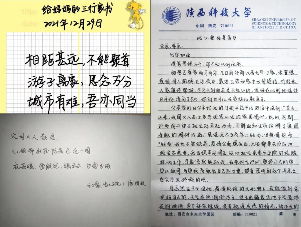 暖家書(shū)架起親情橋梁。此次活動(dòng)的“疫情中的學(xué)子家書(shū)”篇章,各高校通過(guò)廣泛征集父母與學(xué)生間的平安信(微信、短信等形式),在新媒體平臺(tái)進(jìn)行集中展示,為暫時(shí)不能回家的學(xué)子帶來(lái)親情的支持。比如,在我校進(jìn)行的“三行家書(shū),待你親啟”活動(dòng)中,信息181班學(xué)生劉苗寫(xiě)給媽媽:“相距甚遠(yuǎn),不能聚首,游子離家,思念萬(wàn)分,城市有難,吾亦同當(dāng)?!蔽靼彩痛髮W(xué)的一位學(xué)生家長(zhǎng)在信中寫(xiě)道:“兒子,我希望你注意做好個(gè)人防護(hù)的同時(shí),堅(jiān)守住志愿者的崗位。沒(méi)有哪一代人的青春不經(jīng)過(guò)淬煉,只要你們心中有火、眼中有光,我們國(guó)家的明天一定會(huì)更加強(qiáng)大!”一封封飽含深情的家書(shū)將學(xué)生家庭納入到了學(xué)校疫情防控的鏈條中,形成良好的家校聯(lián)動(dòng)機(jī)制,提升了高校疫情防控整體水平。