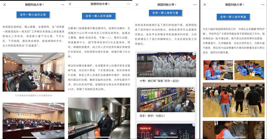 大接龍傳遞磅礴力量。此次活動(dòng)的“高校青年戰(zhàn)‘疫’故事”篇章,依托微信平臺(tái)開(kāi)展,陜西“高校青年同心戰(zhàn)‘疫’@大接龍”活動(dòng)吸引全省90余所高校積極參與,各高校依托學(xué)校官方微信公眾平臺(tái)發(fā)布本校在抗擊疫情中的防控措施、暖心故事等,累計(jì)閱讀量已超過(guò)70萬(wàn)+。比如,我校官微發(fā)布的推文《以吾之名守護(hù)》,用一個(gè)個(gè)“群體素描”記錄了抗擊疫情過(guò)程中發(fā)生在校園內(nèi)外的溫暖瞬間。西北工業(yè)大學(xué)發(fā)布的推文《看疫情防控中的西工大擔(dān)當(dāng)!》,集中展現(xiàn)了全體師生員工勇?lián)姑?、并肩抗疫,從?yán)、從快、從細(xì)、從實(shí)抓好疫情防控工作的優(yōu)良作風(fēng)。本次@大接龍通過(guò)傳遞疫情防控中涌現(xiàn)出來(lái)的英模人物與感人事跡,讓廣大青年師生感受奮斗的激情,體悟奉獻(xiàn)的偉大,實(shí)現(xiàn)思想共振、情感共鳴、行動(dòng)共進(jìn)。