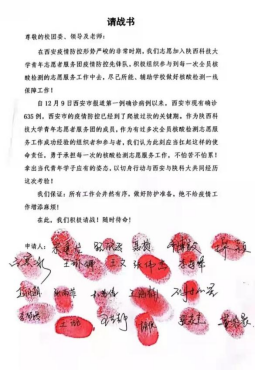 2022年1月2日,馬克思主義學(xué)院教師范昕在以《攜手同心戰(zhàn)“疫”,彰顯精神偉力》為題的的線上直播報(bào)告上,提到了他們。范昕說:“(校青團(tuán)的同學(xué)們)在請戰(zhàn)書上按下的紅手印讓我動容,樸素而堅(jiān)毅的話語讓我淚目?!?/p>