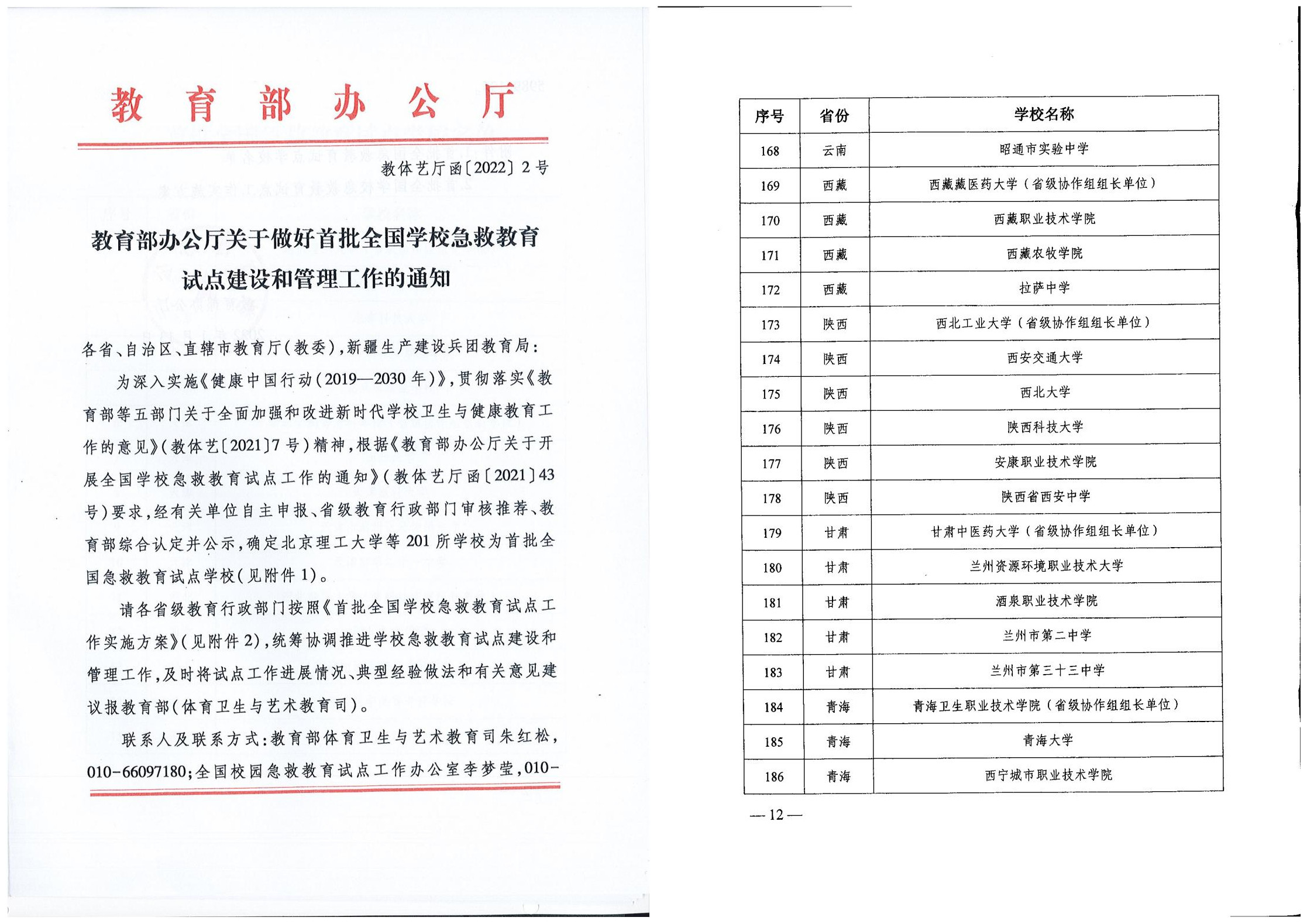 近日,教育部辦公廳下發(fā)《關(guān)于做好首批全國(guó)學(xué)校急救教育試點(diǎn)建設(shè)和管理工作的通知》(教體藝廳函[2022]2號(hào)),我校成功獲選首批全國(guó)學(xué)校急救教育試點(diǎn)學(xué)校,為陜西僅有的兩所省屬高校之一。