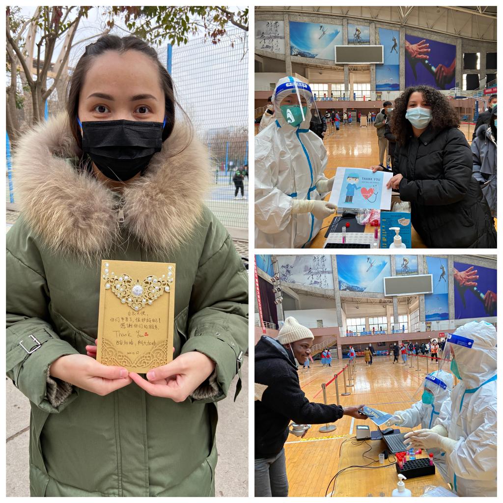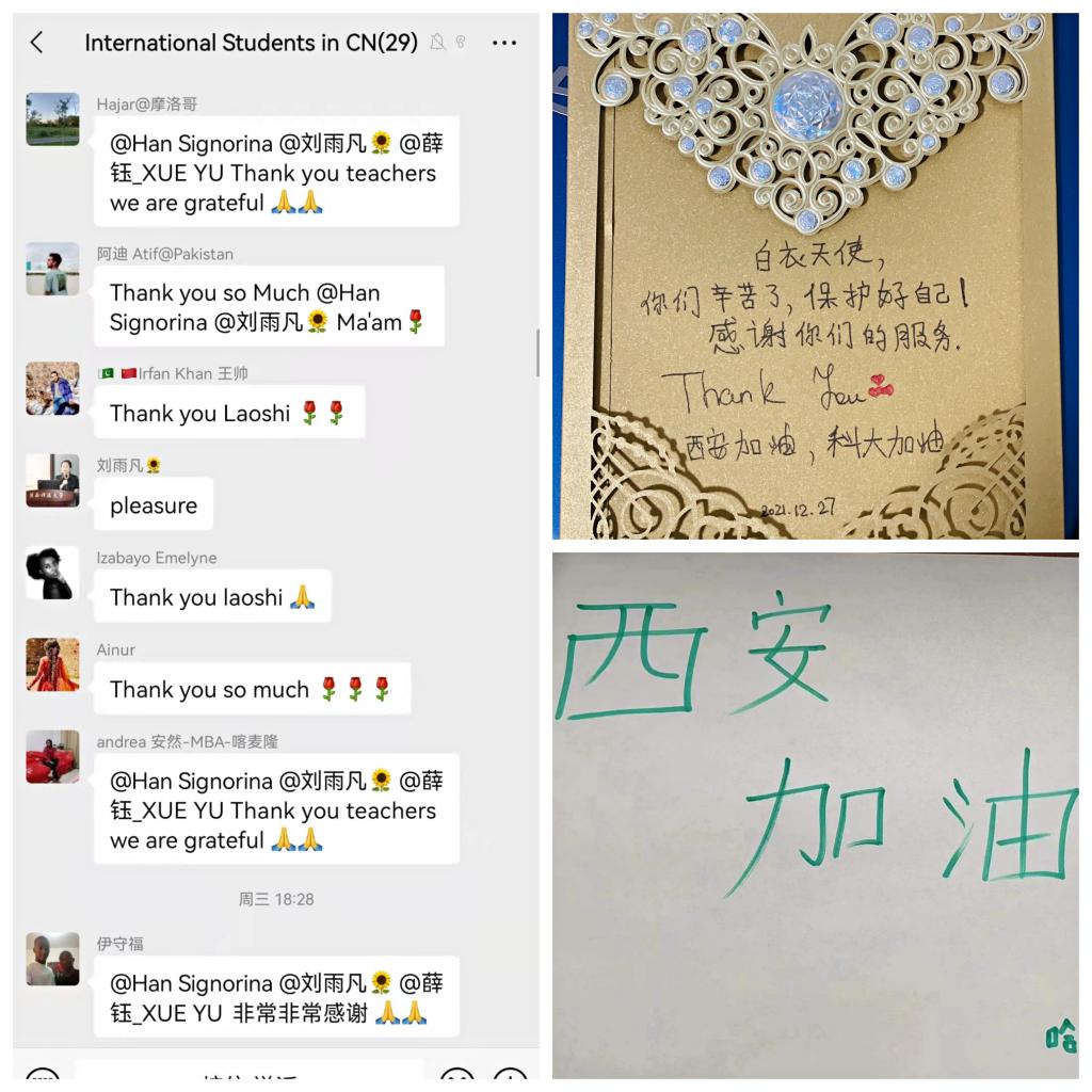 全球疫情蔓延,留學(xué)生們紛紛表示,中國是最安全的地方、學(xué)校是最保險的區(qū)域。來自哈薩克斯坦的博士研究生Ainur(愛琳)制作的精美手卡,寫道:“白衣天使,你們辛苦了!保護好自己,感謝你們得服務(wù)?!笨吹结t(yī)護人員每天從早到晚為大家做核酸,不知如何表達感激之情的留學(xué)生們,用稚嫩的筆觸、青澀的口吻,真情流露。國際處的老師時常提醒他們注意防護,保持積極的心態(tài)。說到過年是否回國,他們大都表示會在陜過年。比起回家,留在中國,留在學(xué)校,更安全。