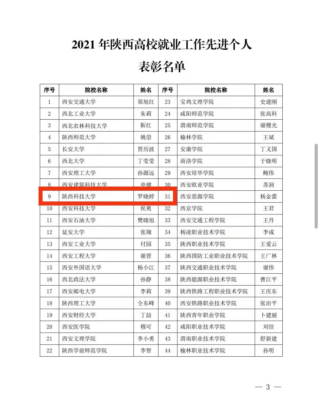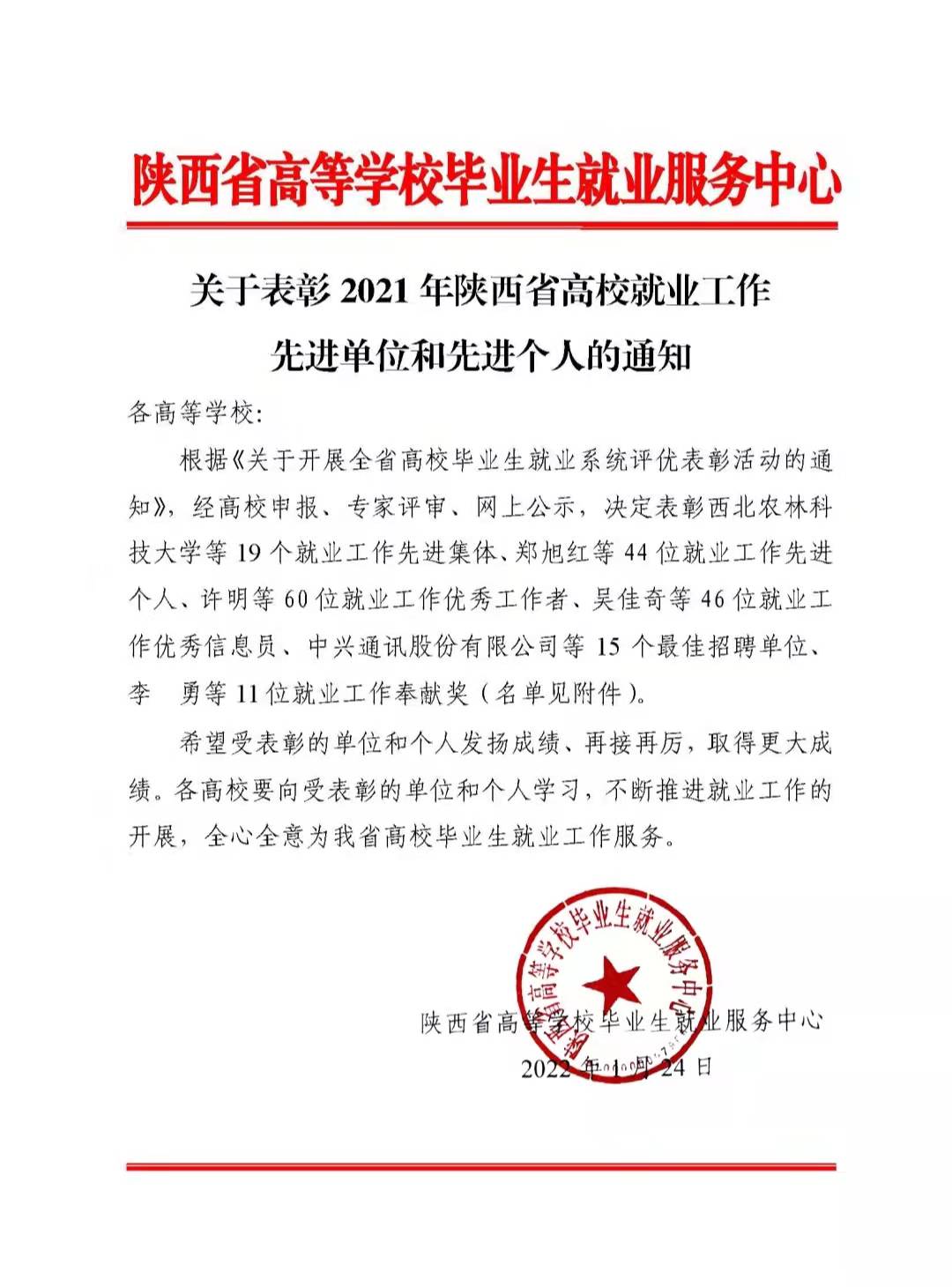 近日,陜西省高等學(xué)校畢業(yè)生就業(yè)服務(wù)中心印發(fā)《關(guān)于表彰2021年陜西省高校就業(yè)工作先進(jìn)單位和先進(jìn)個(gè)人的通知》,我校榮獲2021年陜西高校就業(yè)工作“先進(jìn)集體”,就業(yè)指導(dǎo)中心羅曉婷同志榮獲2021年陜西高校就業(yè)工作“先進(jìn)個(gè)人”,輕工科學(xué)與工程學(xué)院黨委副書記張乾隆同志榮獲2021年陜西高校就業(yè)工作“優(yōu)秀工作者”,就業(yè)指導(dǎo)中心張蕓同志榮獲2021年陜西高校就業(yè)工作“優(yōu)秀信息員”。